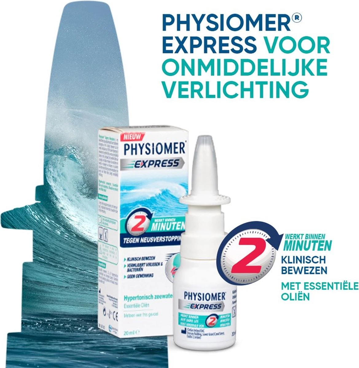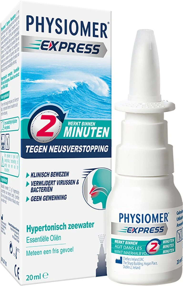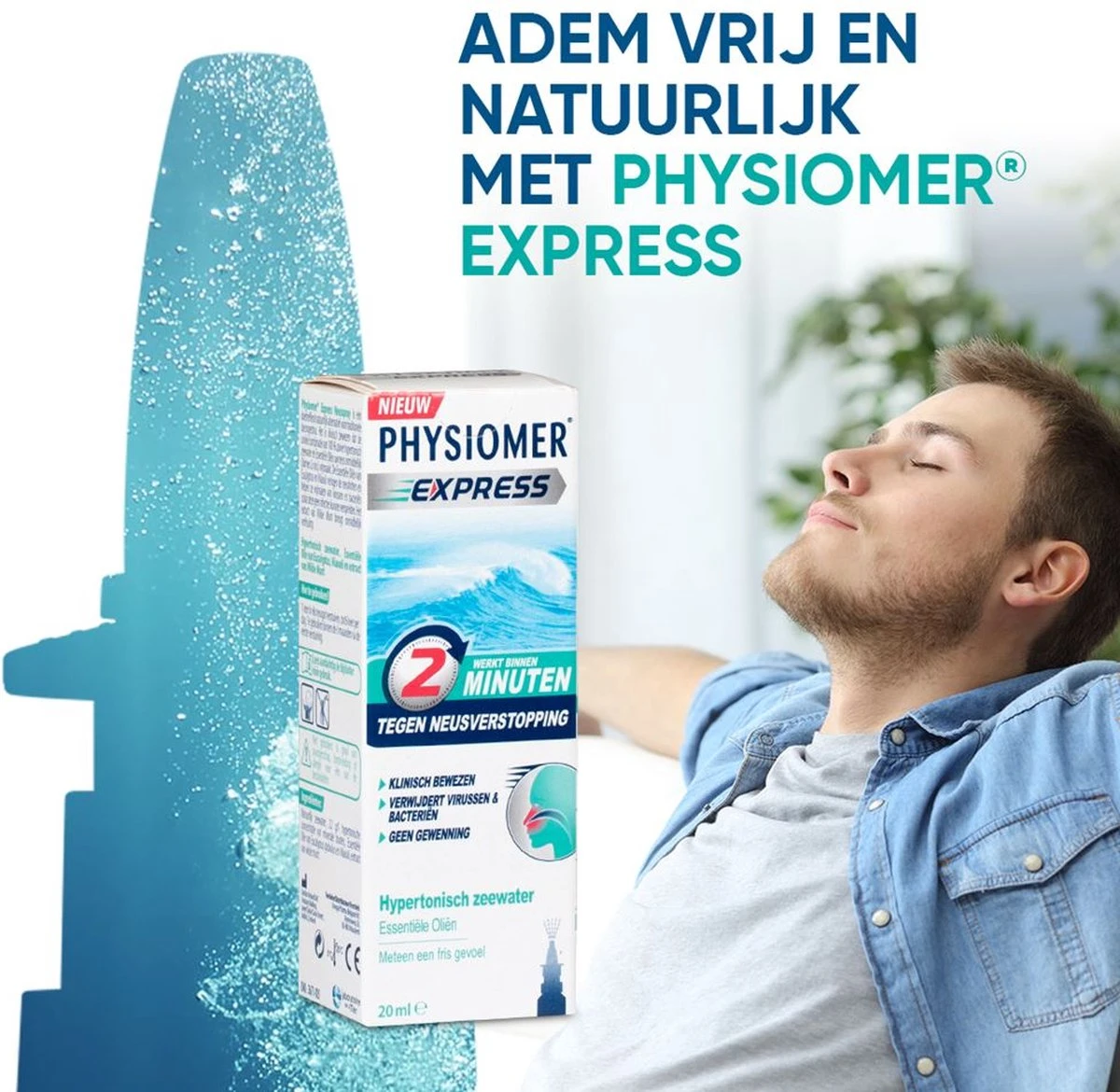 PHYSIOMER® Express Neusspray zorgt voor onmiddellijke verlichting en maakt de verstopte neus binnen 2 minuten vrij. Het is een doeltreffend natuurlijk alternatief voor traditionele decongestiva in geval van een neusverkoudheid en heeft een uitstekende tolerantie. PHYSIOMER® Express Neusspray brengt geen schade toe aan de werking van het neusslijmvlies. De PHYSIOMER® Express is een handige neusspray in pocketformaat op basis van hypertonisch zeewater. PHYSIOMER®, de natuurlijke en efficiënte oplossing om beter te kunnen ademen.