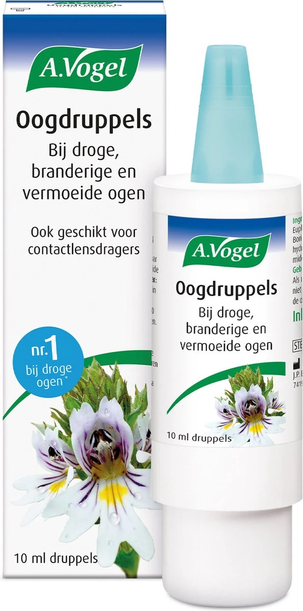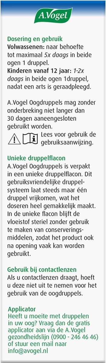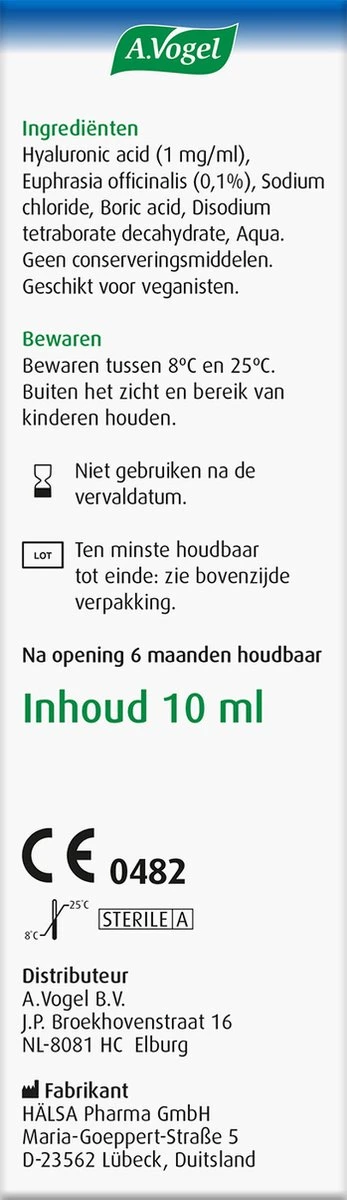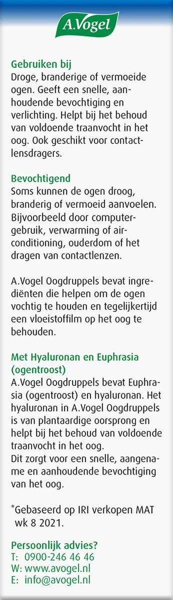 A.Vogel Oogdruppels bevatten de natuurlijke ingrediënten Euphrasia (ogentroost) en hyaluronan. Het hyaluronan in A.Vogel Oogdruppels is gemaakt met onder andere plantaardige, niet genetisch gemanipuleerde soja en niet van dierlijke afkomst. Het helpt bij het behoud van voldoende traanvocht in het oog. Hierdoor zorgt het voor een snelle, aangename en aanhoudende bevochtiging van het oog. Alle ingrediënten op een rij: