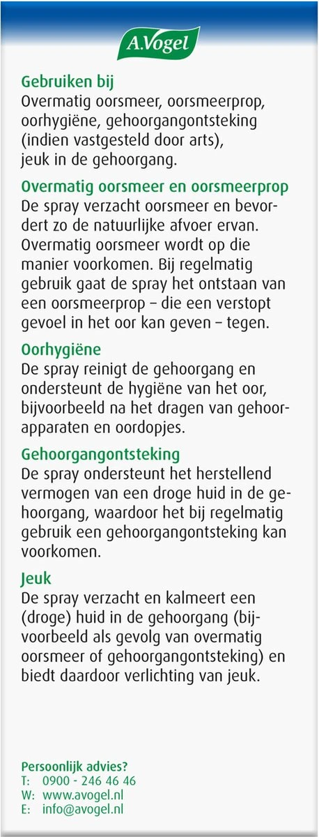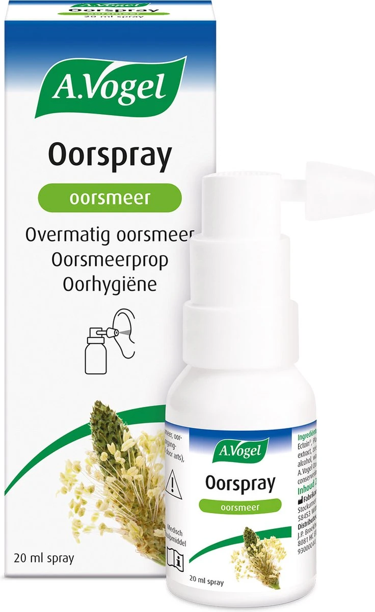 Heb je last van overmatig oorsmeer? A.Vogel Oorspray oorsmeer is een natuurlijke oplossing die het oorsmeer verzacht en de natuurlijke afvoer ervan bevordert. Bij regelmatig gebruik gaat het oorsmeerproppen tegen.