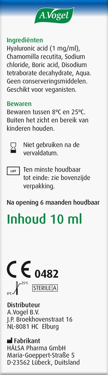 | Ingrediënten | Samenstelling: Hyaluronic acid (1 mg/ml), Chamomilla recutita, Sodium chloride, Boric acid, Disodium tetraborate decahydrate, Aqua. Geen conserveringsmiddelen. Geschikt voor veganisten. |