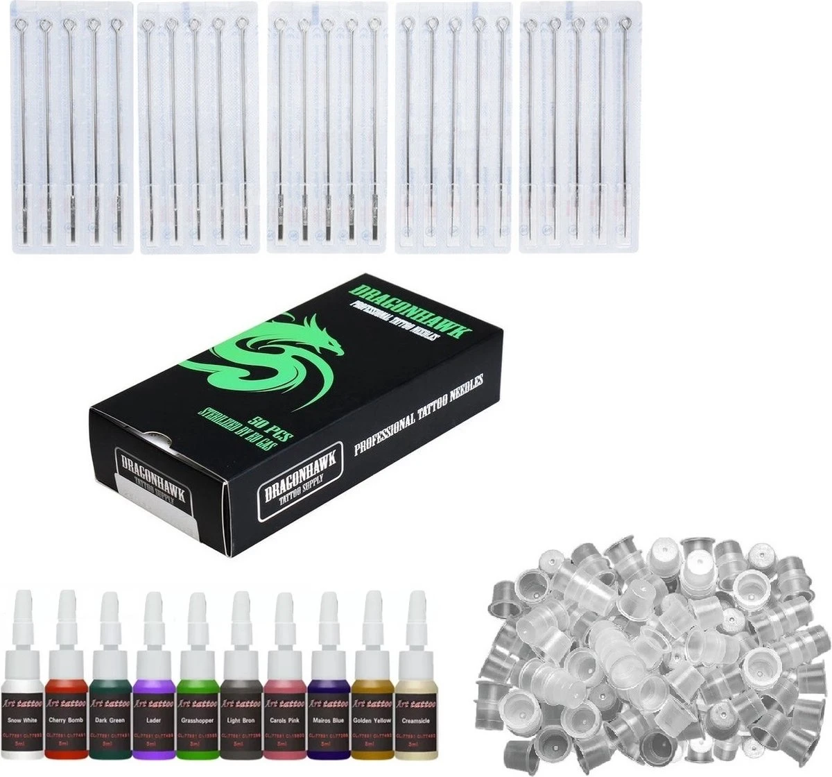 Set van 10x tattoo inkt, 20x tattoo naalden en 50x inktcups.