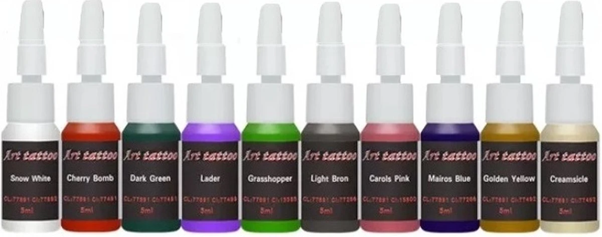 De 10 flessen met verschillende kleuren inkt worden willekeurig verstuurd; u krijgt dus 10 verschillende kleuren tattoo inkt, maar niet altijd dezelfde kleuren als afgebeeld.