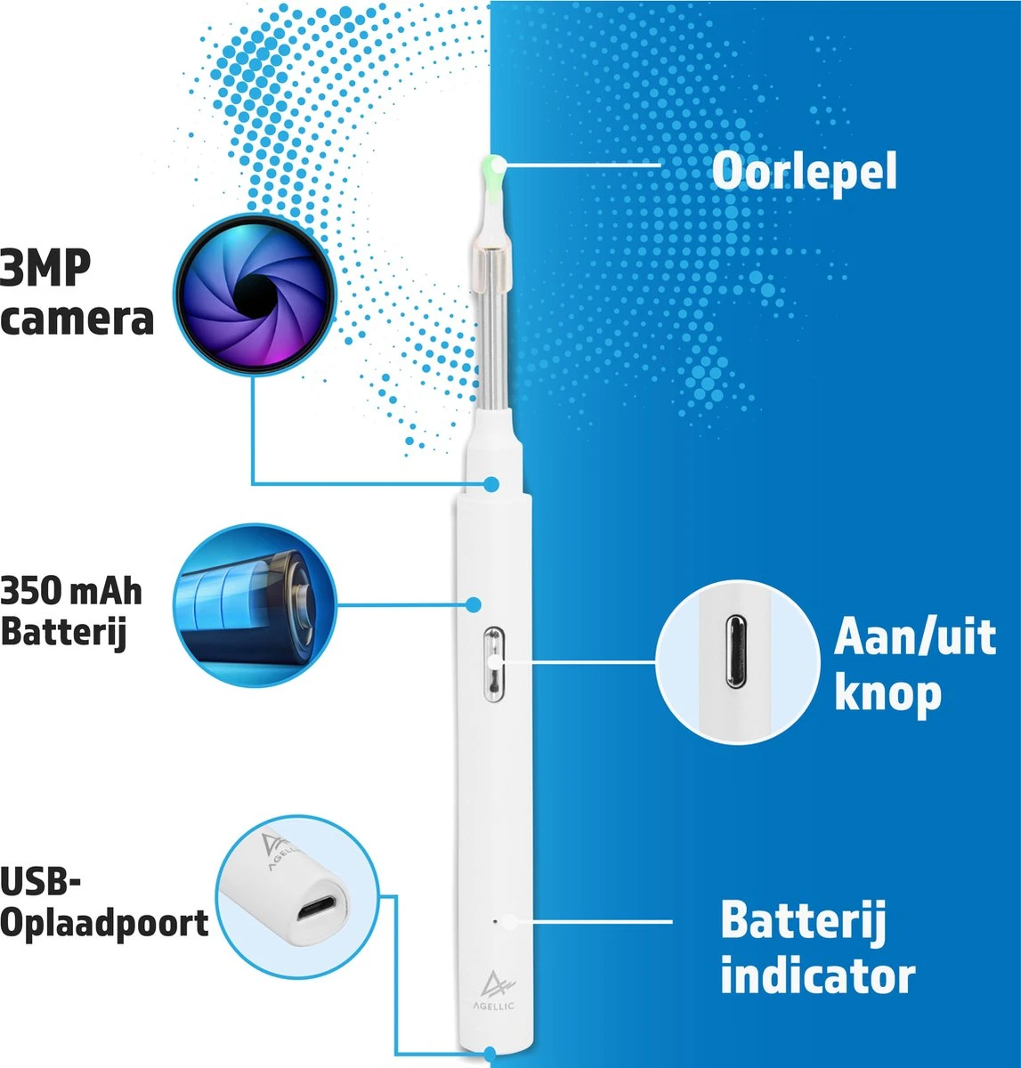 De Agellic® oorsmeer verwijderaar bestaat uit krachtige camera van 3 MegaPixel, waardoor goed te zien is waar het vuil in jouw oor zich bevindt. Daarnaast heeft de oorsmeer verwijderaar een gevoelige en precieze sensor met 6 ingebouwde LED lampje die ervoor zorgen dat al het vuil goed zichtbaar is.