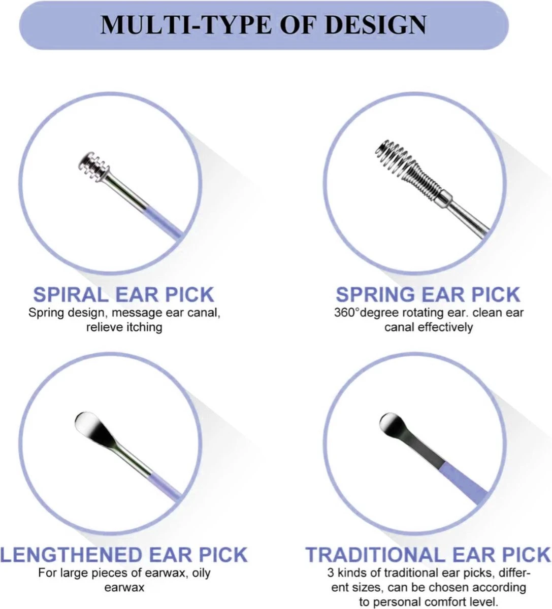 Verschillende maten van de oordopjes kunnen op verschillende gehoorgangen worden aangebracht. Het speciale veerontwerp is zeer effectief voor het verzamelen van zowel olieachtig oorsmeer als droog oorsmeer. 6 curettereinigers van verschillende grootte om zowel zacht als hard oorsmeer efficiënt te reinigen en om uw gehoorgangen een ontspannende massage en goede reiniging te geven.