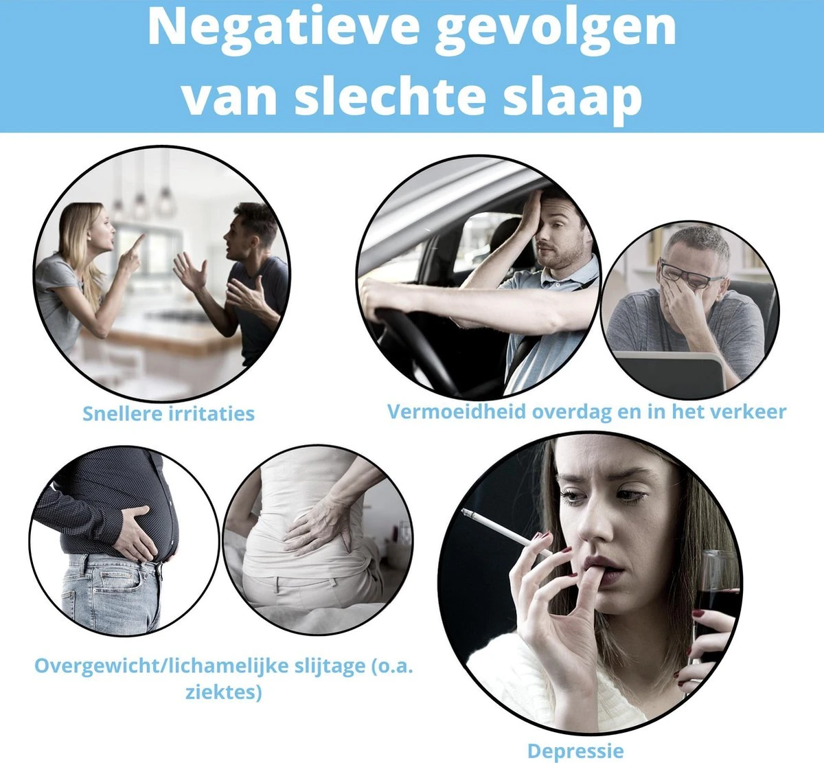En dat is niet het enige….. slaap, genoeg slaap, is ongelooflijk belangrijk. De laatste paar jaren is onze behoefte aan slaap steeds meer wetenschappelijk onderzocht. Door te weinig slaap krijgt het hele lichaam te weinig rust, te weinig zuurstof. Je stofwisseling is uit balans, je lichaam heeft te weinig tijd om eten, indrukken en gevoelens te verwerken. Dus je krijgt problemen, je bent moe, minder fit, geïrriteerd, snel afgeleid, je wordt dikker, je huid wordt grauwer, je haar straalt minder en je blijkt ineens een nukkige bank-aardappel, en je had jezelf altijd voorgenomen dat nooit te worden. Je relatie lijdt hieronder maar je legt je hierbij neer, en je partner moet dat ook maar doen. Dat is nu eenmaal zo, iedereen heeft wat, er is niks aan te doen.