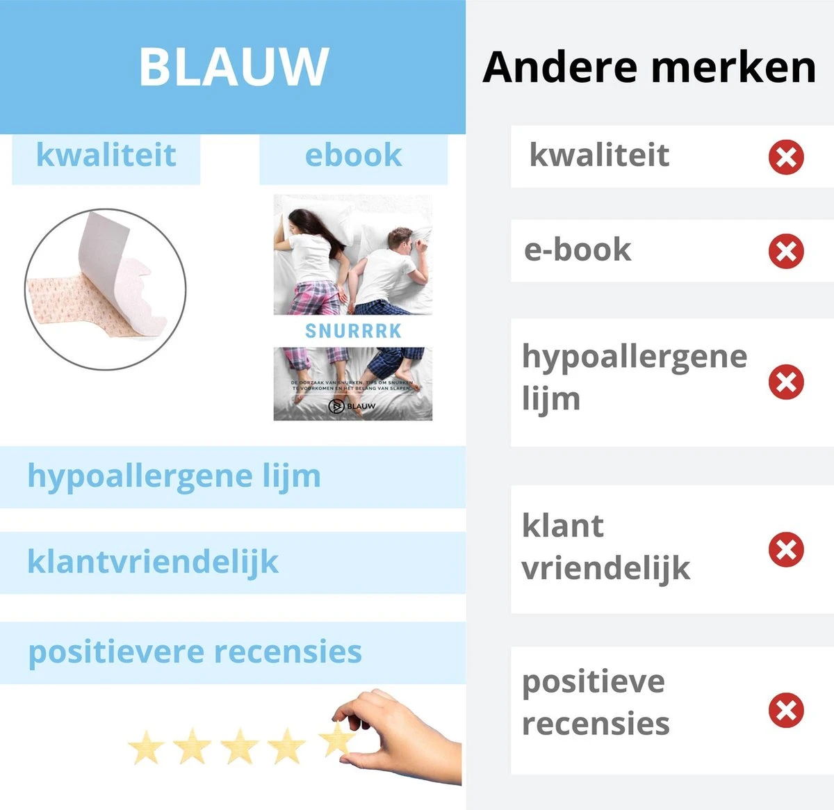 In de neusstrips van BLAUW® zijn verbeteringen aangebracht ten opzichte van wat er nu op de markt is. De neusstrips van BLAUW® zijn gemaakt op basis van medische hypoallergene lijm. Hierdoor blijven de neusstrips goed plakken tijdens het slapen (mensen met een gevoelige huid krijgen geen last van irritaties) en zijn ze ook gemakkelijk met water te verwijderen. Wij bieden graag goede kwaliteit, want slaap is voor iedereen van belang. Daarom hebben wij gekozen voor de neusstrips die de beste kwaliteit bieden voor een betere prijs. Bovendien krijg je bij ons een e-book erbij met tips en informatie over slaap en snurken. Deze krijg je via de mail één dag na het plaatsen van je bestelling.
