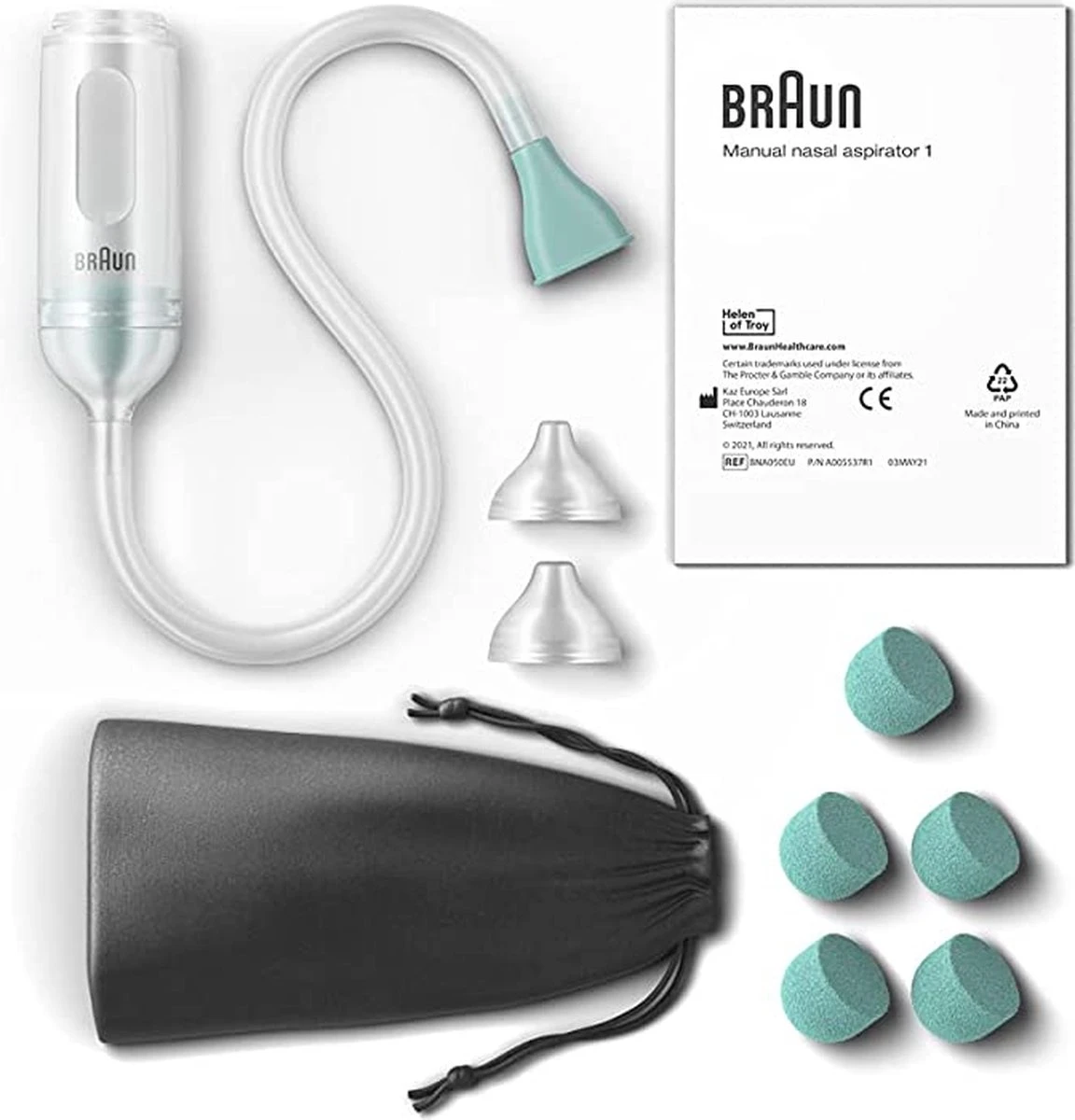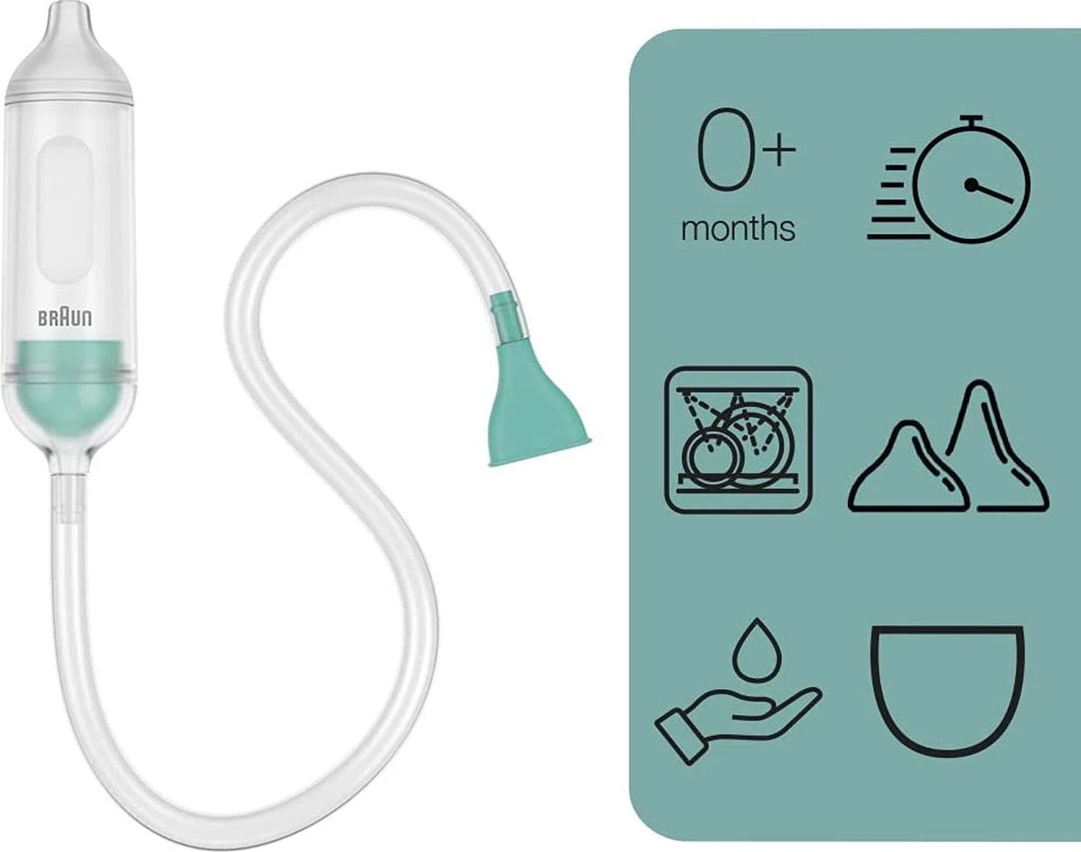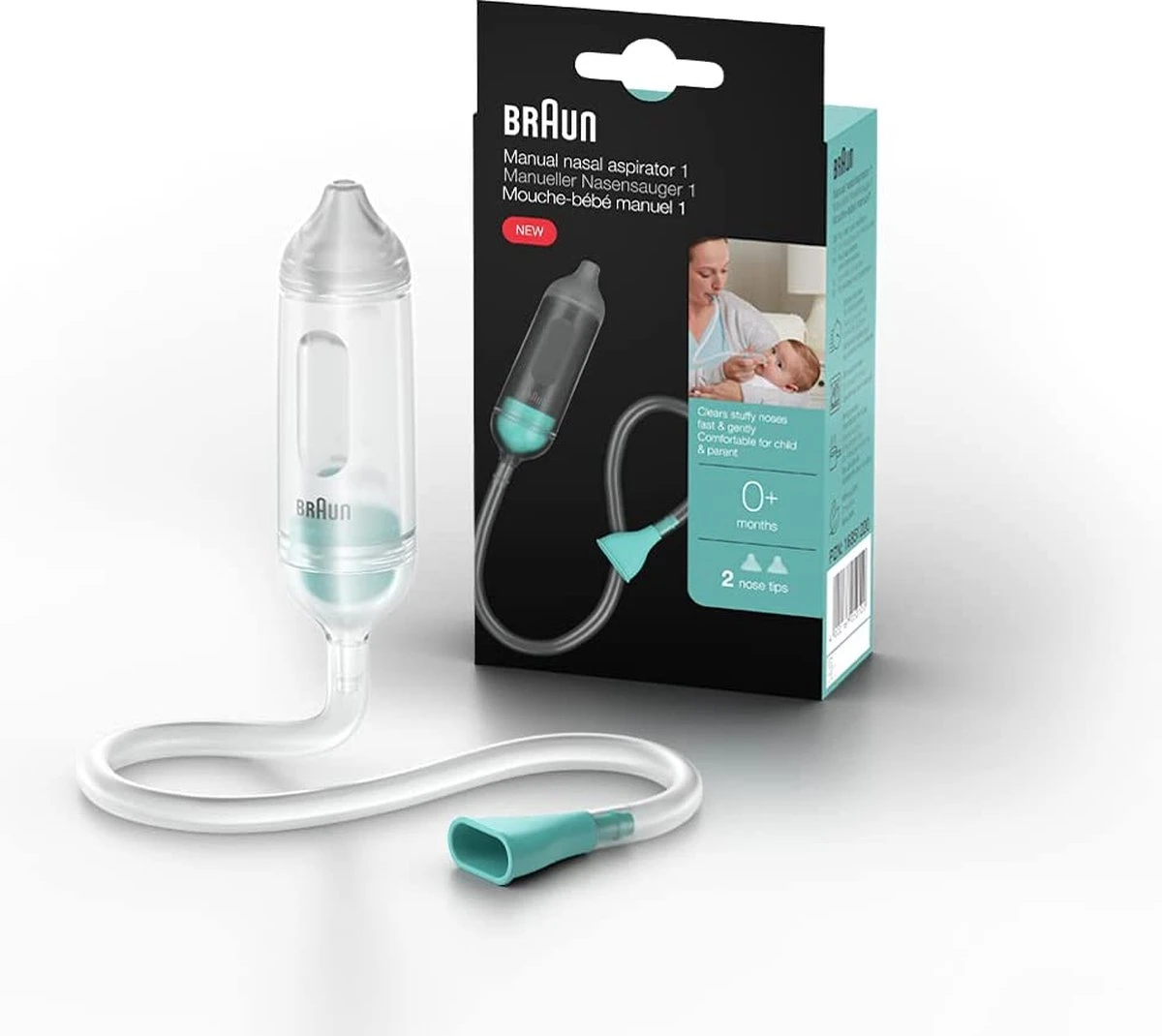 De Braun Handbediende neusreiniger 1 is gebruiksvriendelijk en zorgt ervoor dat uw kind prettiger kan eten, ademen en slapen, door directe verlichting bij een verstopte neus. Geschikt vanaf 0 maanden; werkt uiterst voorzichtig, omdat u de zuigkracht bepaalt. U verwijdert het slijm gemakkelijk en zonder gedoe, dankzij de twee zuigmondjes die comfortabel en goed passen, zelfs in de kleinste neusjes. De neusreiniger werkt gemakkelijk en zonder gedoe, dankzij de praktische en hygiënische slijmfilters voor eenmalig gebruik en omdat de onderdelen gewoon in de vaatwasmachine kunnen worden gewassen (behalve het buisje, dat apart met kokend water moet worden gereinigd). De neusreiniger is zonder BPA gemaakt en heeft een veilig, stevig ontwerp dat ook in een druk gezinsleven zonder problemen doet wat hij moet doen, namelijk verlichting bieden bij een verstopte neus.