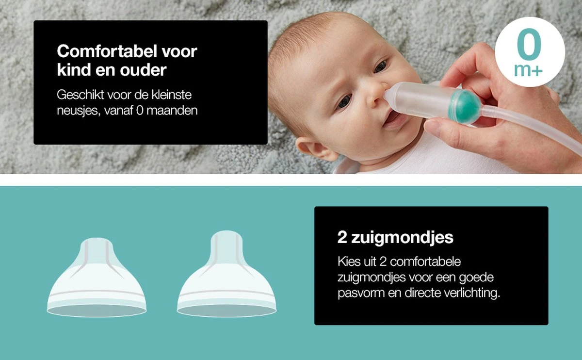 - GESCHIKT VANAF 0 MAANDEN: Met 2 zuigmondjes voor zelfs de kleinste neusjes. Plaats de neusreiniger op de juiste manier in de neus van uw kleintje; het moet goed in de neus aansluiten voor een goede werking.