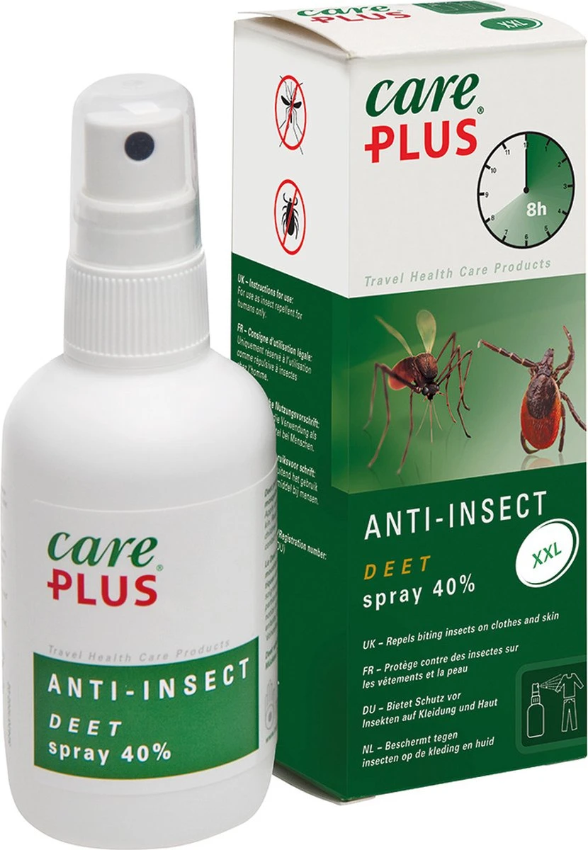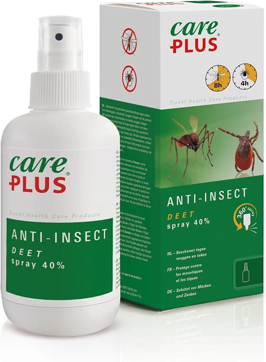 Daarnaast zijn er ook nog middelen met een afwerende werking die je op je huid kunt smeren. De bekendste is natuurlijk Anti-Insect met DEET van Care Plus®.