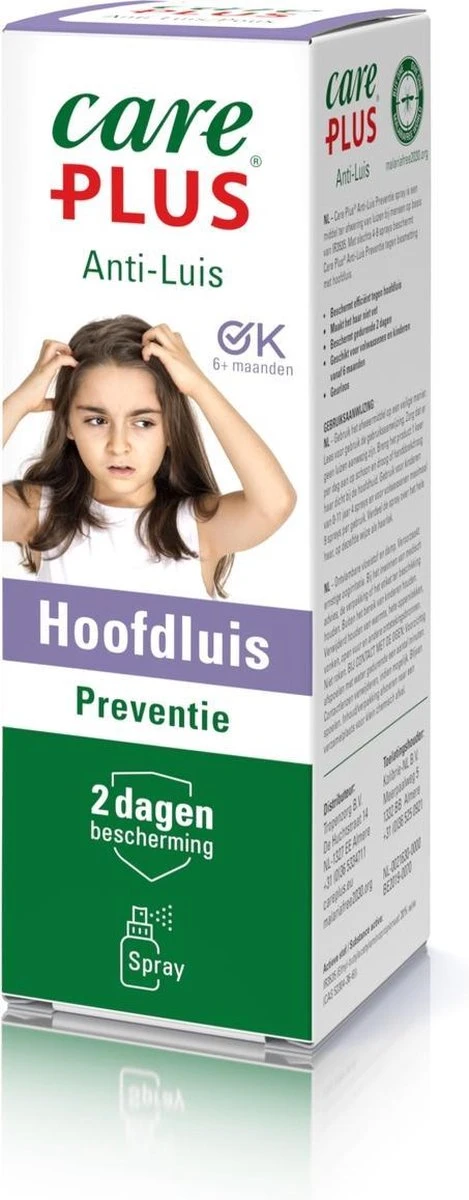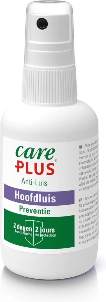 Care Plus Anti Luis Preventie Spray voorkomt hoofdluis door een geur die voor hoofdluizen erg onaangenaam is, maar voor mensen geurloos. Deze effectieve spray met de werkzame stof IR3535 beschermt 2 dagen lang, maakt het haar niet vet en is veilig te gebruiken door volwassenen, kinderen en baby’s vanaf 6 maanden. Bovendien is het zacht voor de hoofdhuid waardoor het geen jeuk of irritatie veroorzaakt.