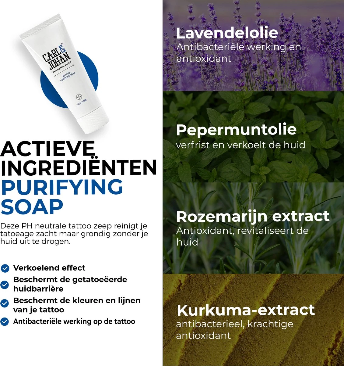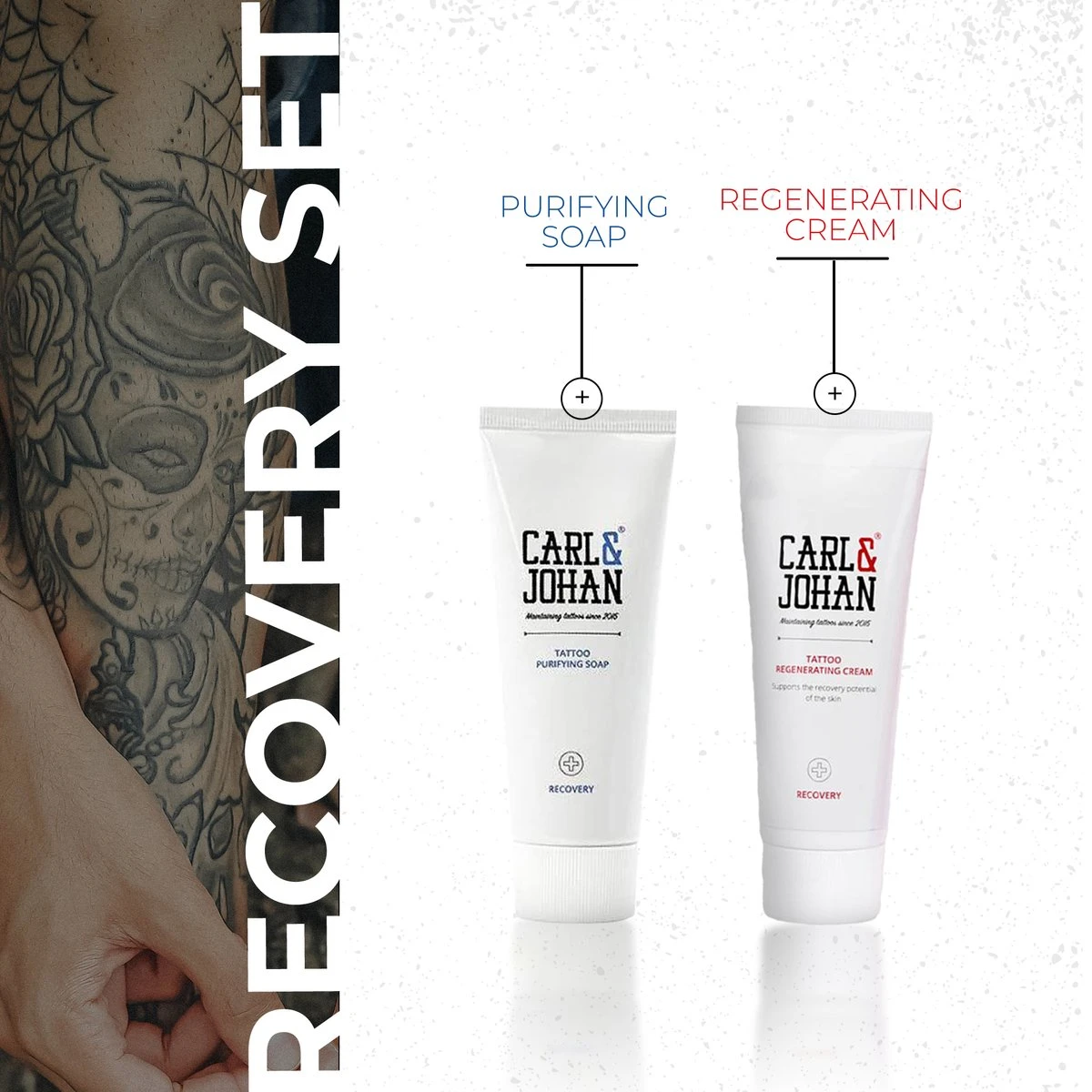 Dit recovery pack bevat dé essentials voor snel en duurzaam herstel na plaatsing van je nieuwe tattoo. Met de PH-neutrale purifying soap reinig je de getatoeëerde huid zacht maar grondig. Deze antibacteriële tattoo zeep heeft een verkoelend effect en beschermt de huid tegen infecties, uitdroging en korstjes. Carl & Johan regenererende crème ondersteunt en versnelt het natuurlijke herstelproces van de huid. De natuurlijke ingrediënten in deze tattoo aftercare crème kalmeren de huid, verlichten jeuk en beschermen tegen invloeden van buitenaf.