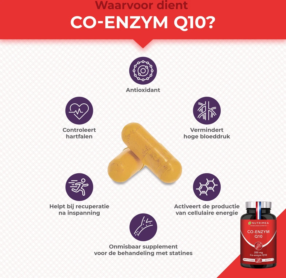 Co-enzym is een krachtige natuurlijk antioxidant, aanwezig in alle cellen van uw organisme, en helpt tegen veroudering. Co-enzym Q10 beschermt uw cardiovasculaire systeem en vermindert uw cholesterolgehalte. Het verhoogt uw vitaliteit en versterkt het immuunsysteem. Belangrijk : vanaf 45 jaar, wordt een supplement van Co-enzym Q10 ten zeerste aanbevolen, want je lichaam synthetiseert minder en minder.