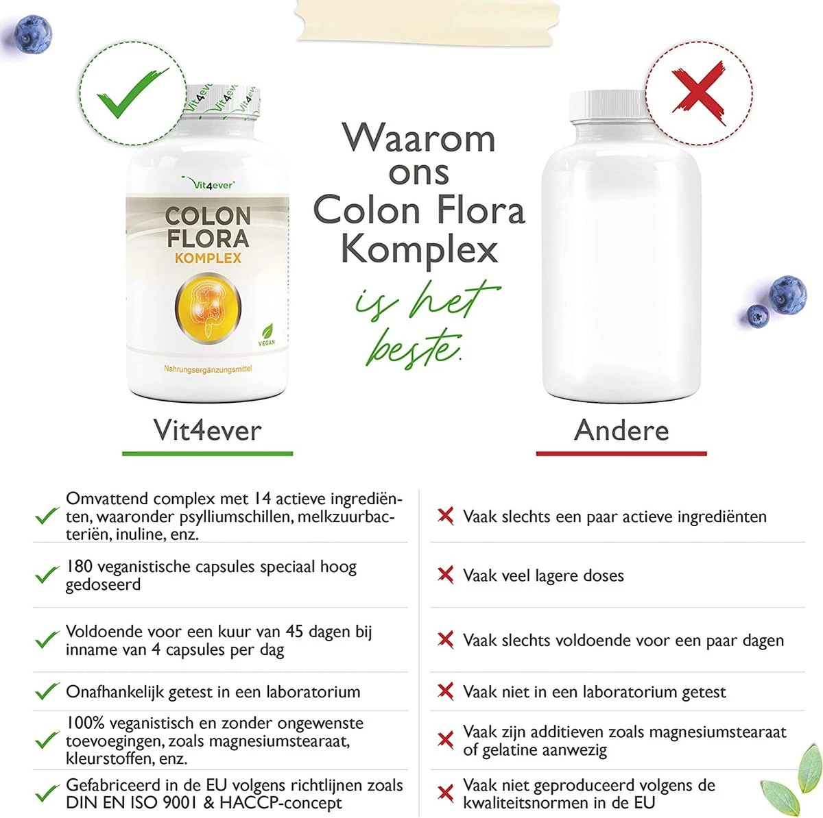 Colon Flora – 180 Natuurlijke Colon Capsules Met Psyllium Husk, Melkzuurbacteriën (acidophilus), Glucomannaan, Vitamine C, Calcium, Inuline – Veganistisch – Vit4ever