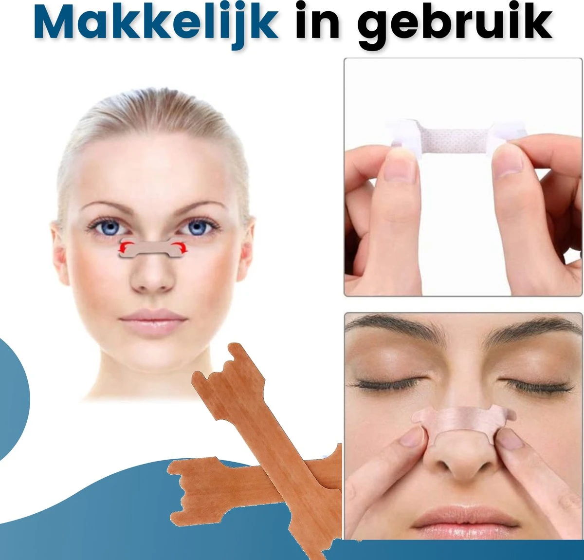 De kegelvormige buisjes moet je zo ver mogelijk in jouw neusgaten inbrengen. Verder kun je de pleisters gebruiken, deze bevestig je strak op de bovenkant van jouw neus.