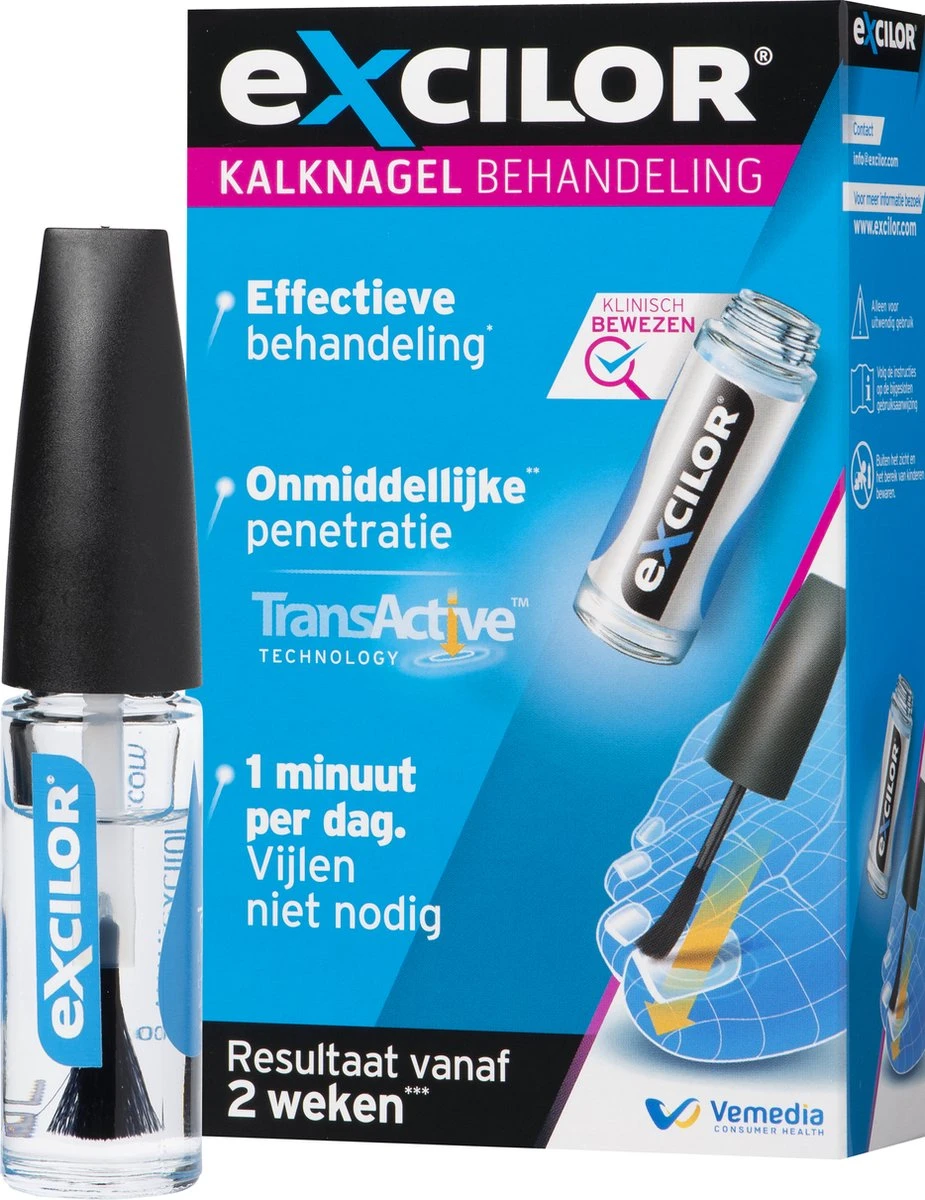 Nagelschimmels groeien in en onder de nagel en zijn moeilijk te behandelen. Een effectieve penetratie van een hard nageloppervlak is moeilijk. Sommige producten vereisen het vijlen van de nagel voordat de behandeling kan worden gestart. Excilor is speciaal ontwikkeld voor de behandeling van kalknagels en is zeer effectief door superieure penetratie van de nagel. Je brengt Excilor eenvoudig aan met het kwastje. Excilor bevat de unieke TransActive penetration technology. Het is klinisch bewezen dat Excilor de nagel diep penetreert zonder vijlen.