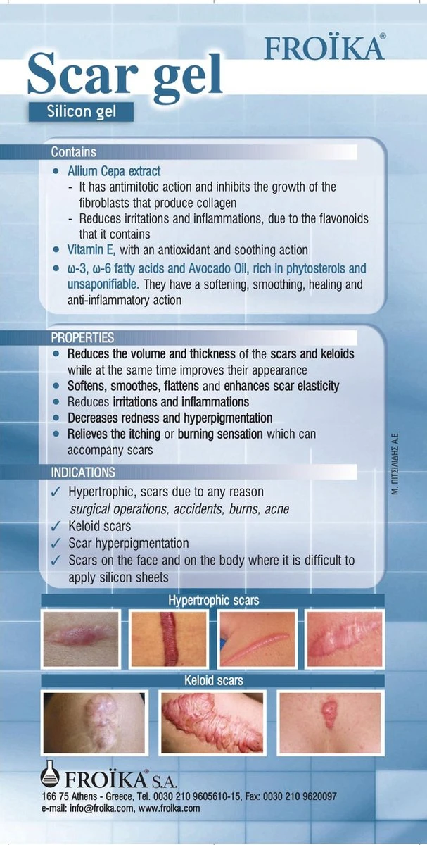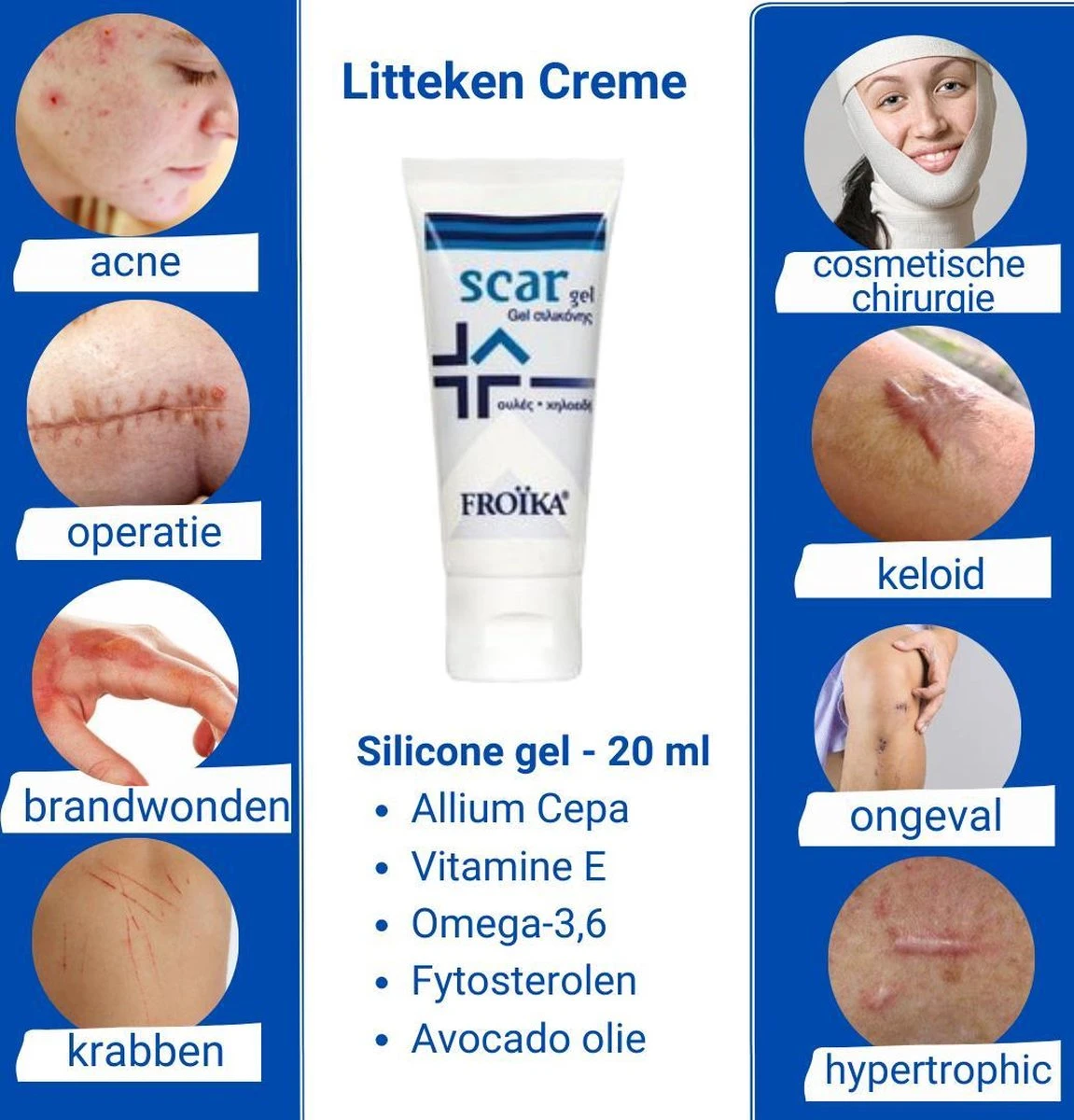 Froika Litteken Crème is een siliconengel die rubberachtige, waterdichte statisch-elektrische laag op de huid vormt die de opeenhoping van collageenvezels op het littekenweefsel ontwricht. Hierdoor wordt het volume en de dikte van littekens verminderd, waardoor littekens minder zichtbaar worden.