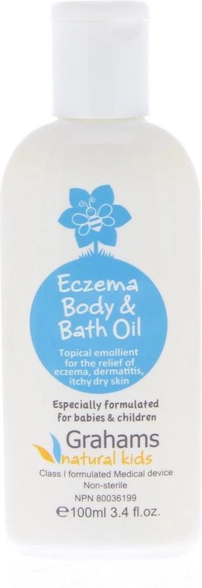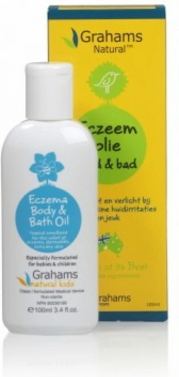 Grahams Eczeem Olie is speciaal ontwikkeld voor de gevoelige huid (ook voor baby’s en kinderen), om naast de Grahams Eczeem Crème te gebruiken. Het helpt de symptomen van eczeem, dermatitis, jeukende en droge huid, en andere kleine huid irritaties te verlichten. De olie voedt en verzorgt de huid uitstekend waardoor beter herstel kan optreden. Kan direct op de huid aangebracht worden als huidolie, maar ook met een scheutje in bad waar het een weldadig gevoel aan de huid geeft.
