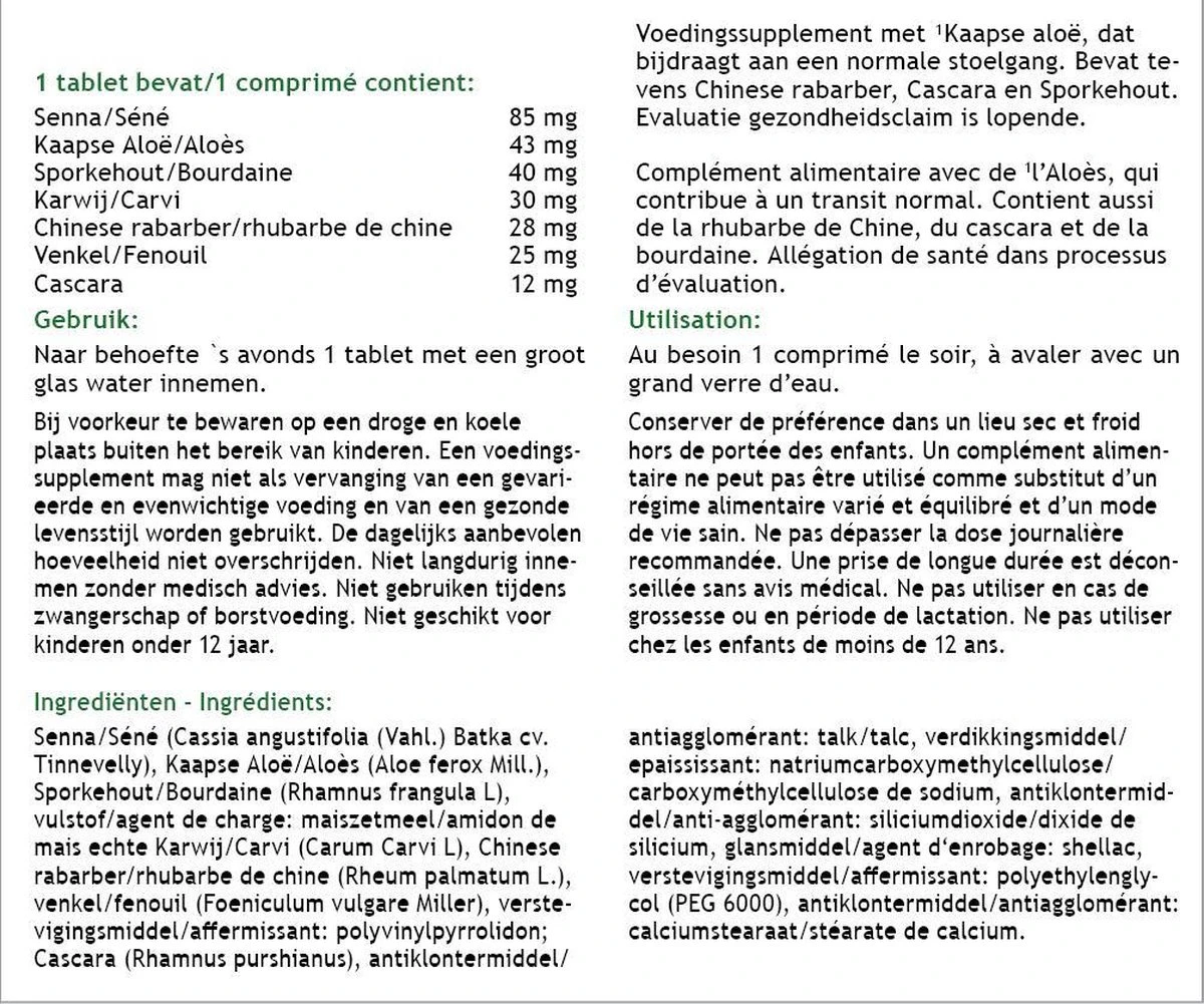 Senna (Cassia angustifolia (Vahl.) Batka cv. Tinnevelly), Kaapse Aloë (Aloe ferox Mill.), Sporkehout (Rhamnus frangula L), vulstof: maïszetmeel, echte Karwij (Carum Carvi L), Chinese rabarber (Rheum palmatum L.), venkel (Foeniculum vulgare Miller), verstevigingsmiddel: polyvinylpyrrolidon; Cascara (Rhamnus purshianus), antiklontermiddel: talk, verdikkingsmiddel: natriumcarboxymethylcellulose, antiklontermiddel: siliciumdioxide, glansmiddel: shellac, verstevigingsmiddel: polyethylenglycol (PEG 6000), antiklontermiddel: calciumstearaat.