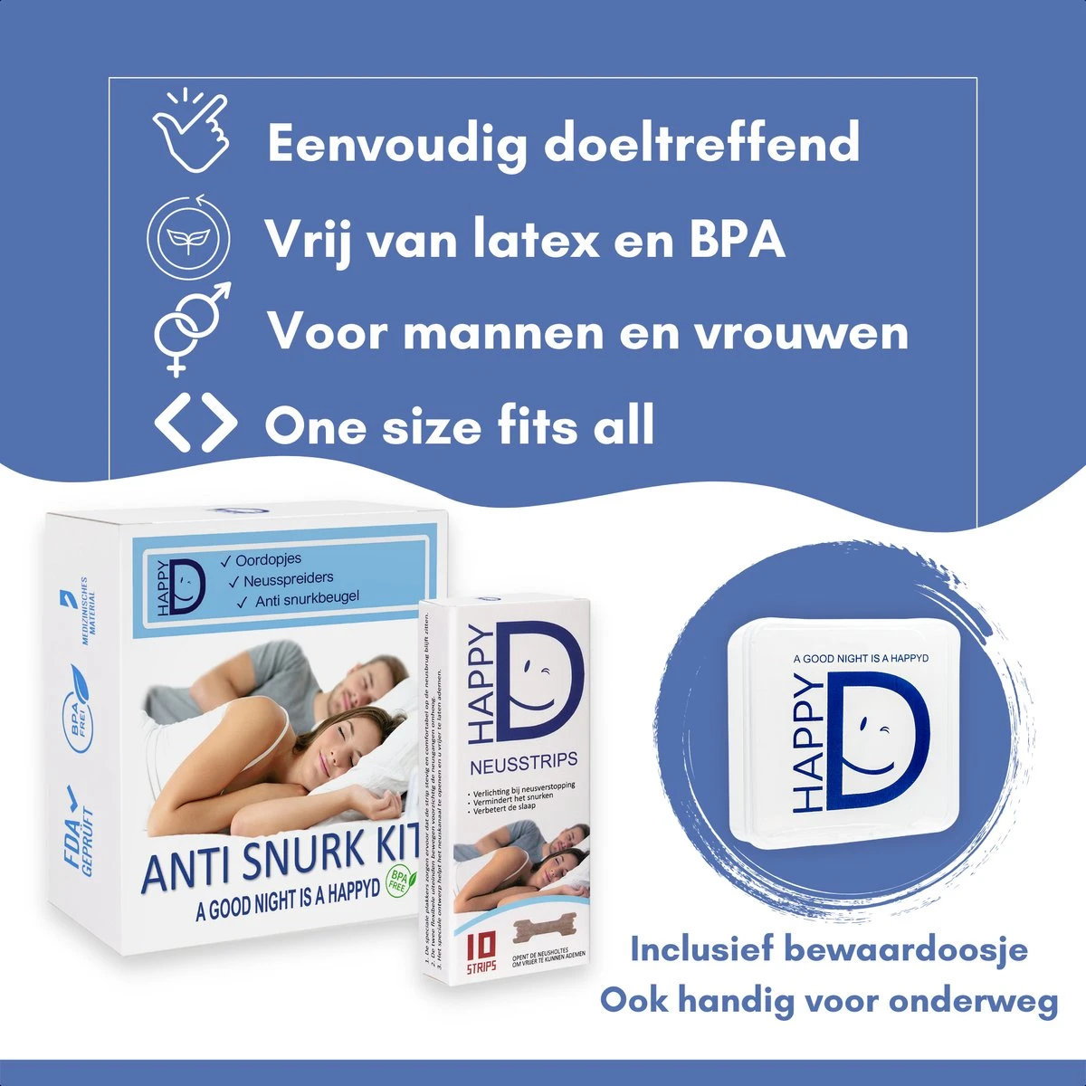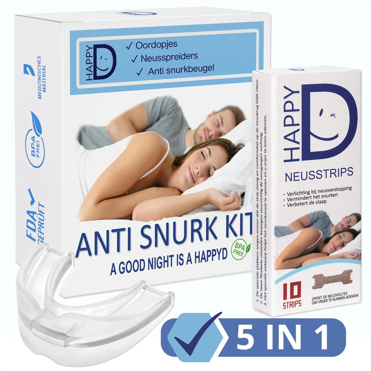 Snurk jij of snurkt je partner en wil je daar op een eenvoudige en snelle manier van af? De 5-delige HappyD Anti Snurk Kit met snurkbeugel, neusspreiders, neusstrips en oordopjes biedt jou de meest complete oplossing om het snurken tegen te gaan! Dit alles tegen een scherpe prijs en inclusief een hygiënisch bewaardoosje om de set netjes in op te bergen. Jouw droom om lekker te slapen wordt werkelijkheid met de Anti Snurk Kit van HappyD.