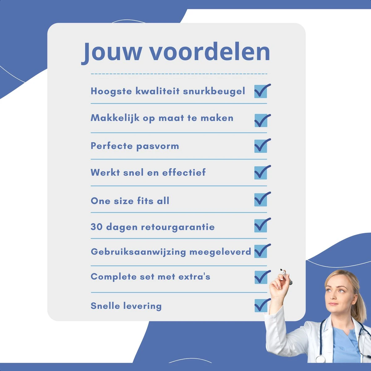 De anti snurkbeugel, Deze wordt wereldwijd het meest gebruikt tegen snurken en is voor 90% van de gebruikers direct effectief. De snurkbeugel zorgt ervoor dat de onderkaak iets naar voren blijft staan. Hierdoor blijft de luchtweg vrij en worden snurken en ook tandenknarsen gestopt. Onze nieuwste anti snurkbeugel is gemaakt van het medische en voedingsgeschikte materiaal EVA. Dit thermoplastische materiaal vormt zich beter naar het gebit zodat de snurkbeugel goed op z’n plek blijft zitten tijdens de nacht en sneller went dan de meeste andere beugels. De snurkbeugel gecombineerd met neusstrips of neusspreiders heeft bij veel snurkers een nog beter effect.