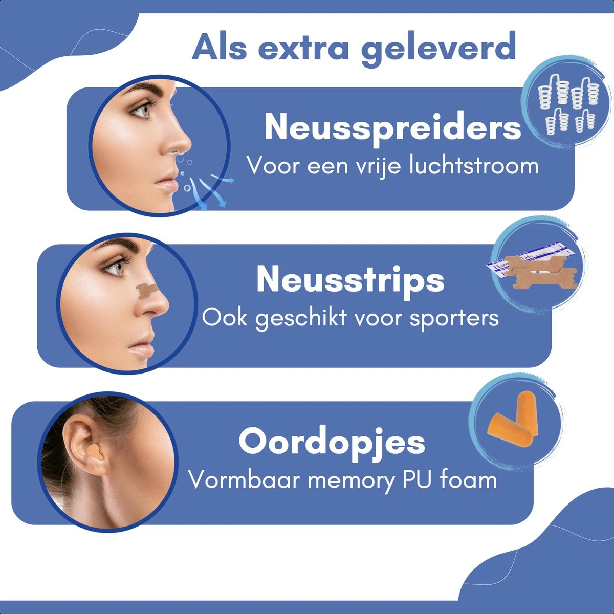 De neusspreiders, De neusspreiders hebben de vorm van plugs en worden geleverd in vier verschillende maten. Zo is er altijd één die past. De neusspreiders zorgen ervoor dat je neusgaten open blijven staan waardoor de neusademhaling soepeler verloopt. Hierdoor krijgen je hersenen extra zuurstof en wordt je uitgeruster en fitter wakker. De neusspreiders zijn net als de neusstrips ook zeer goed te gebruiken tijdens het sporten of bij een neusverkoudheid.