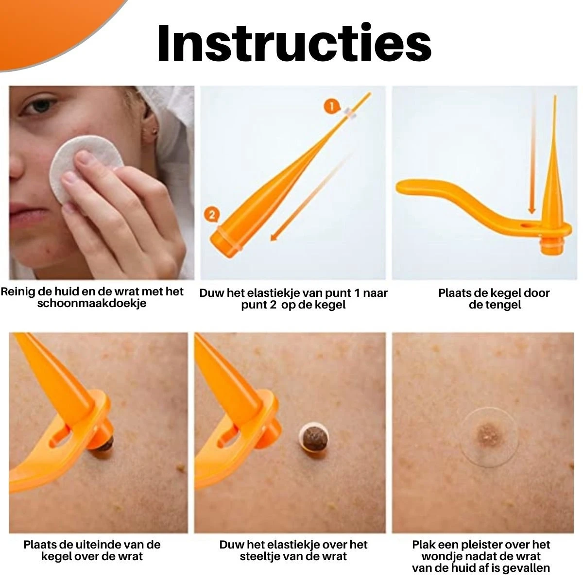 De thuiskit maakt gebruik van een elastiekklem techniek. Daarmee wordt de bloedtoevoer naar de steelwrat afgesloten. Op deze manier droogt het steelwratje uit en laat het los. Dit proces gebeurt geheel pijnloos en zonder te bloeden. Je kan enkel een gevoel van druk ervaren om het steelwratje.