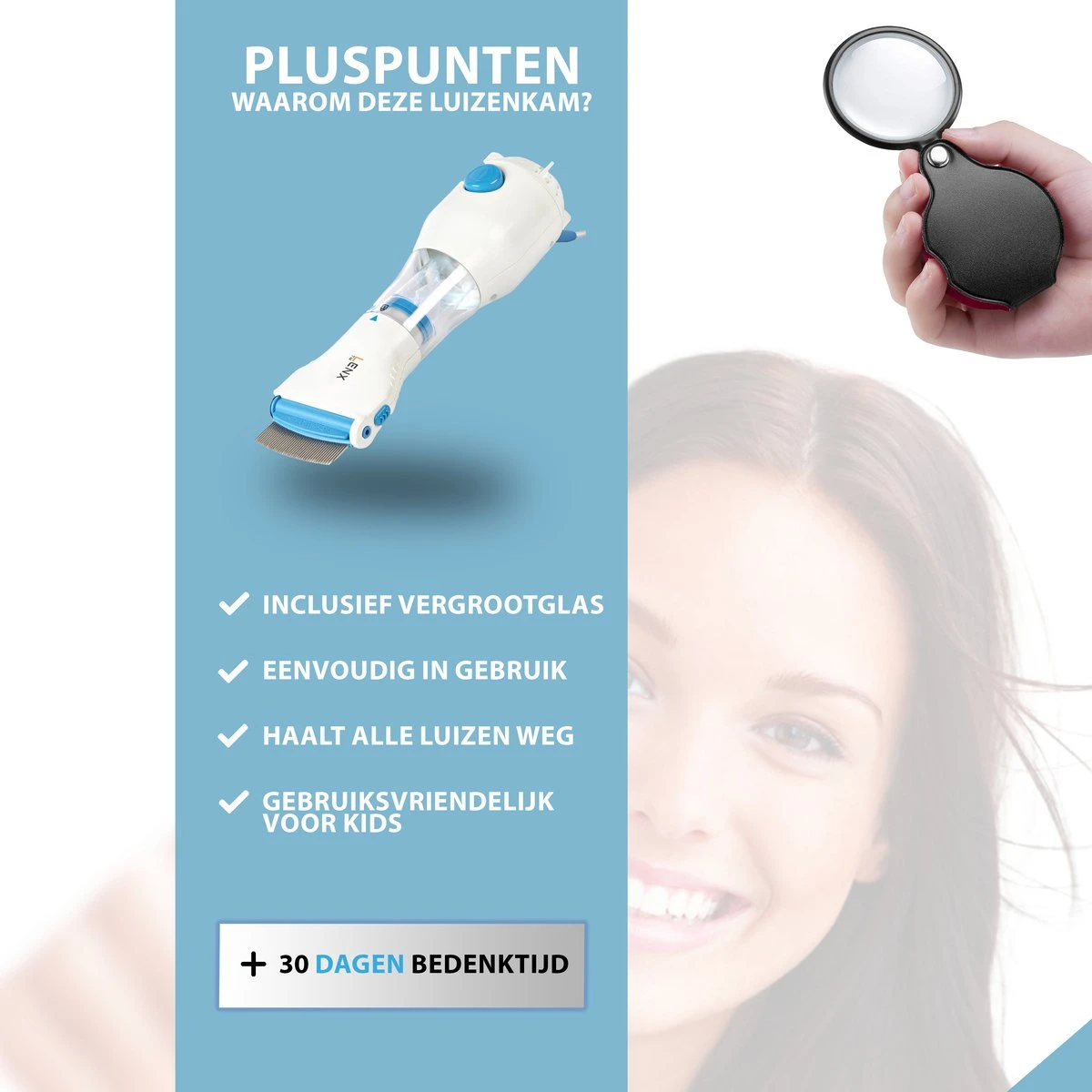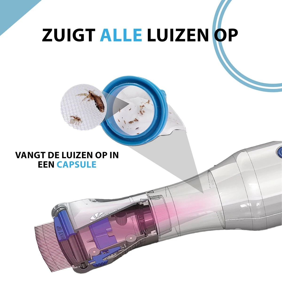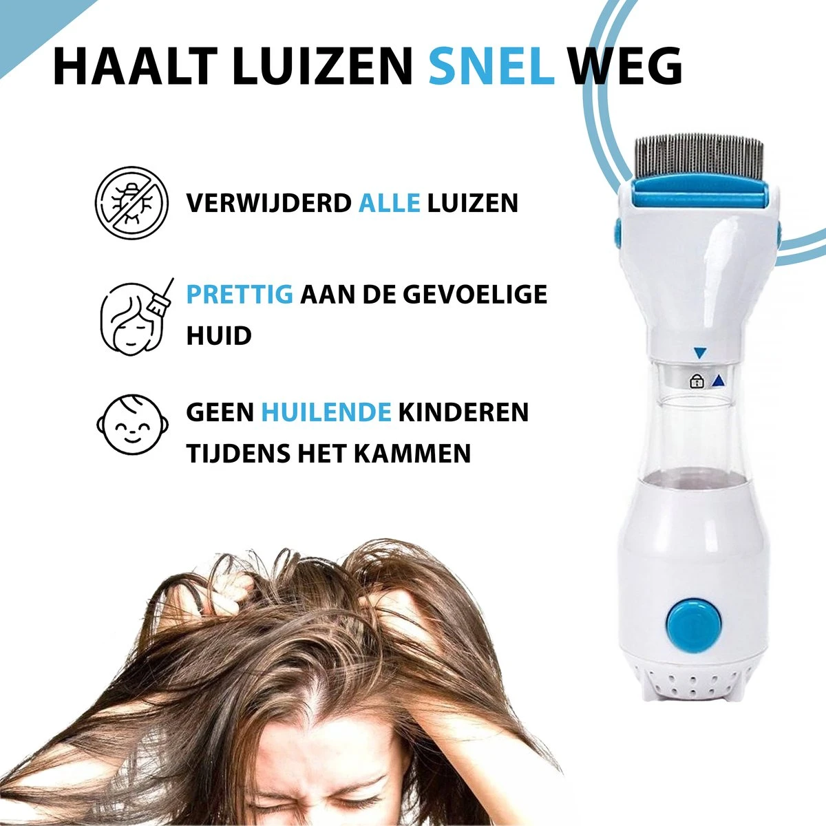 Dit apparaat heeft een roestvrijstalen kam die soepel en aangenaam over de hoofdhuid loopt, waardoor luizen, neten en eitjes voorzichtig worden verwijderd. Na het opzuigen worden alle luizen en hun resten opgevangen door een filter. De filter kan gemakkelijk aan de binnenkant van het toestel worden bevestigd en kan gemakkelijk worden verwijderd. De luizenkam werkt op elektriciteit. Het apparaat werkt het beste op droog haar, als u hebt gedoucht dan moet u uw haar eerst drogen voordat u dit product gebruikt.