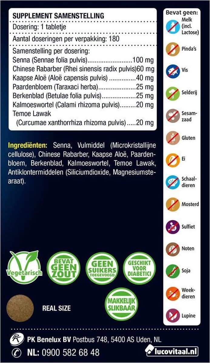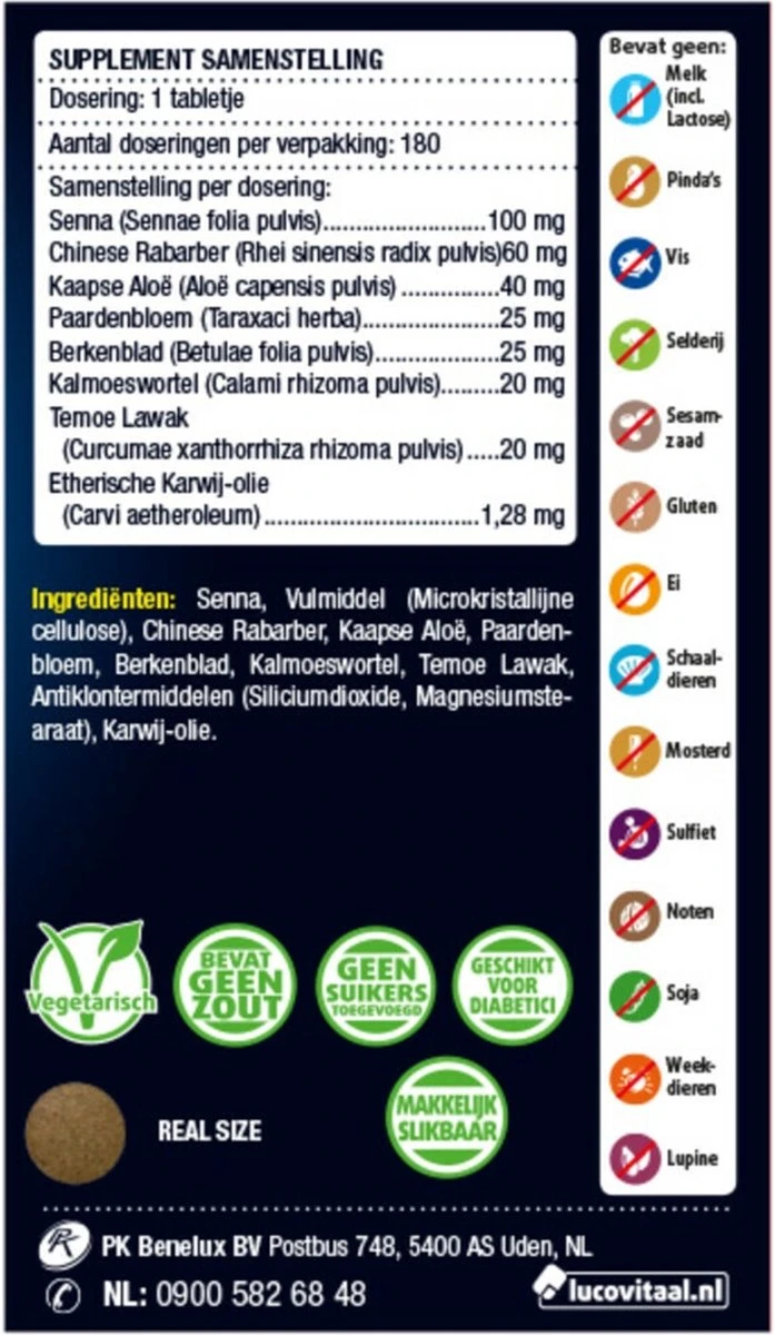 Stoelgang Tabletten met Senna van Lucovitaal® bevat de 10-componentenformule voor darmen en stoelgang. Het ondersteunt de darmwerking en een natuurlijke en regelmatige stoelgang. Het bevat Senna, een kruid dat een laxerende prikkel aan de darmen geeft. De toegevoegde Kaapse Aloë ondersteunt de spijsvertering en regelmatige stoelgang.