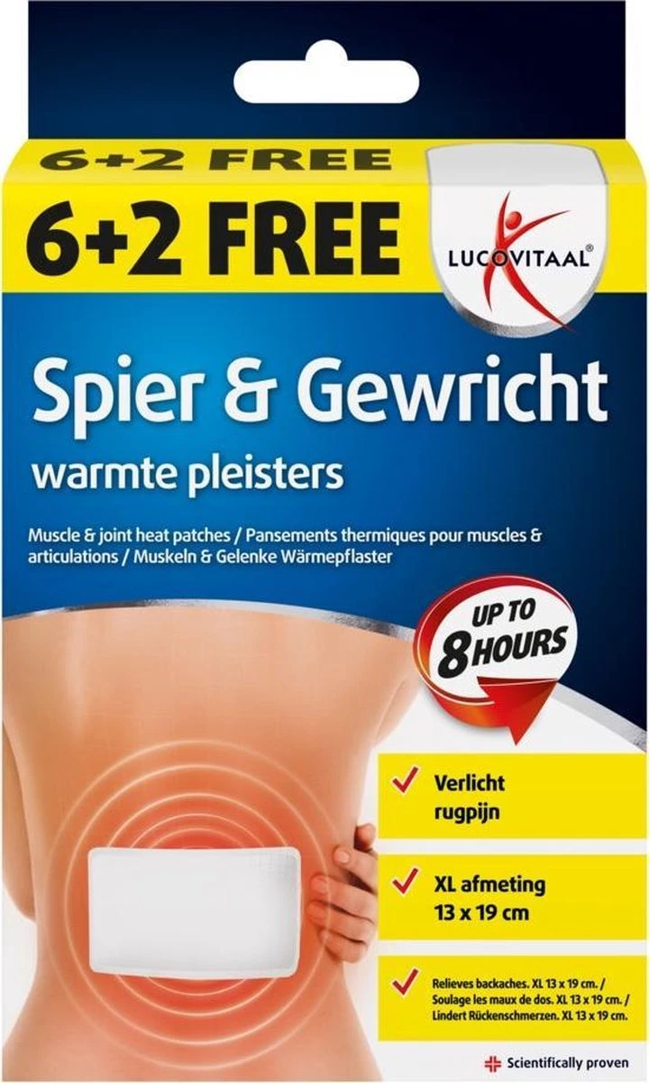 Lucovitaal® Spier & Gewricht warmte pleisters zijn medisch hulpmiddelen ter verlichting van spier- gewrichtspijn. Spier & Gewricht warmte pleisters zijn verkrijgbaar in twee varianten: warmte pleisters voor de (onder)rug en warmte pleisters voor nek- en schouders. De warmte pleisters verhogen de bloedtoevoer en de weefsel zuurstofvoorziening. Bovendien ontspant het de spiercontracties. Samen veroorzaken deze effecten een vermindering van spier- en gewrichtspijn.