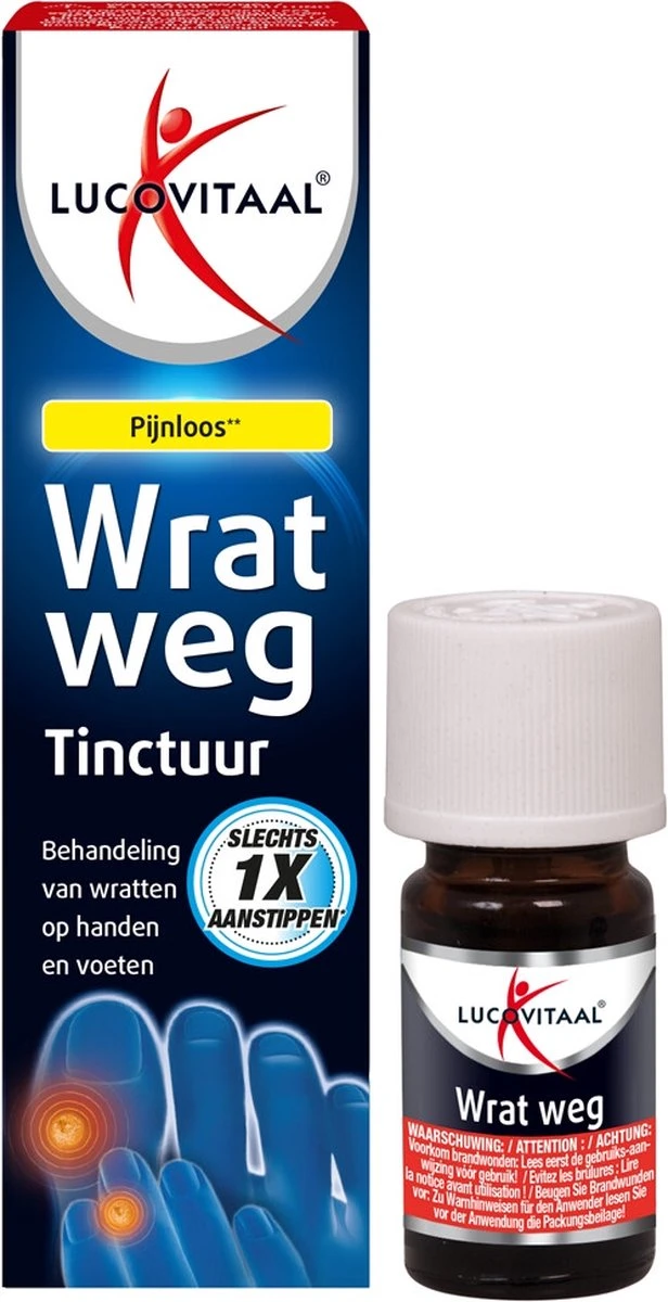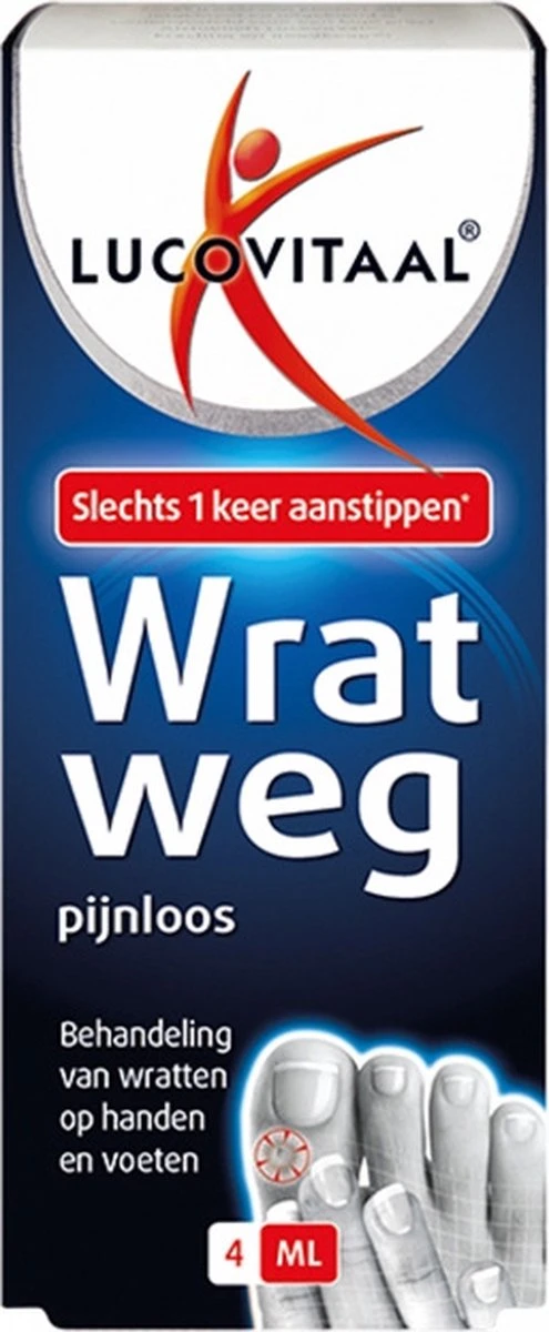 Wrat weg van Lucovitaal® is een medisch hulpmiddel voor de behandeling van gewone wratten op handen en voeten. Het bevat monochloorazijnzuur, een stof die een afbrekende werking heeft op de huid. De wrat zal laagje voor laagje loslaten. Bij gebruik van Wrat Weg van Lucovitaal® hoeft de wrat slechts 1 keer aangestipt te worden*. Het gebruik van Wrat Weg is pijnloos**.