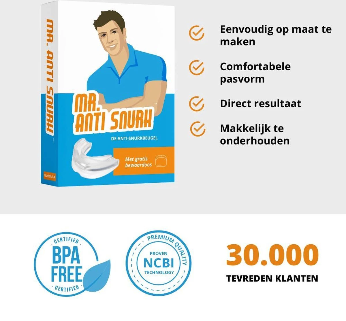 Sinds 2015 heeft de Mr. Anti Snurk beugel al meer dan 75.000 Nederlanders van het snurken afgeholpen. De Snurkbeugel van Mr. Anti Snurk is voor 90% van de snurkers effectief. Dit komt omdat de beugel gemakkelijk en zelf op maat te maken is waardoor de beugel precies is afgestemd op je gebit.