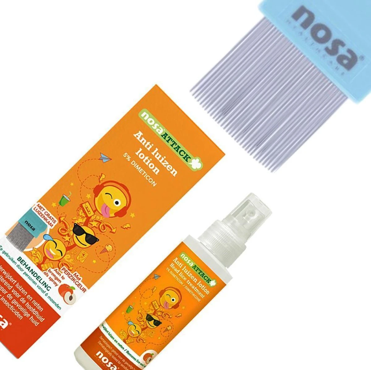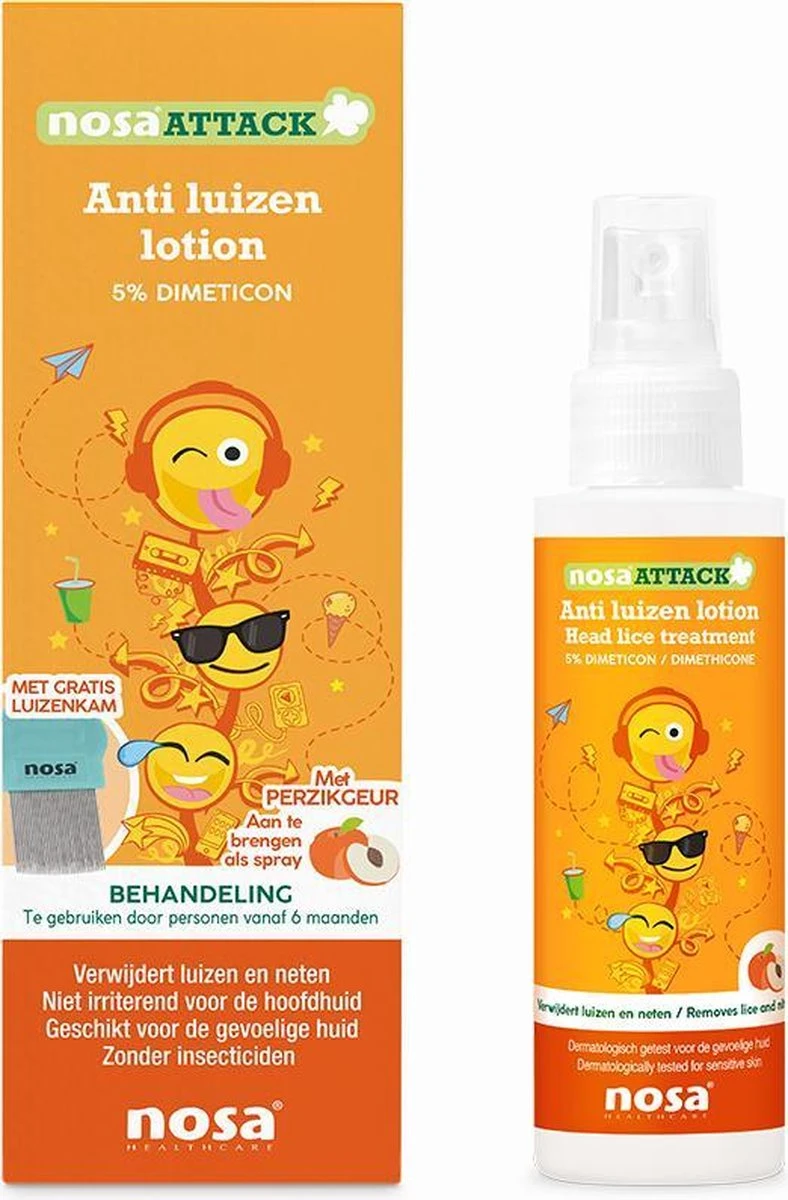 De lotion bestaat uit een unieke combinatie van siliconen en hoge concentratie dimeticon, die een filmlaag vormt die de dood van de luizen en neten veroorzaakt. Bovendien maakt NosaAttack dimeticon lotion het haar zacht en glad, waardoor luizen en neten moeiteloos kunnen worden verwijderd met de luizenkam. Het haar blijft gehydrateerd en de lotion is niet irriterend voor de hoofdhuid. Doordat de lotion aangebracht wordt als spray, is het product maximaal te benutten; het is eenvoudig in gebruik en zeer precies aan te brengen. Ideaal voor zowel kort als lang haar