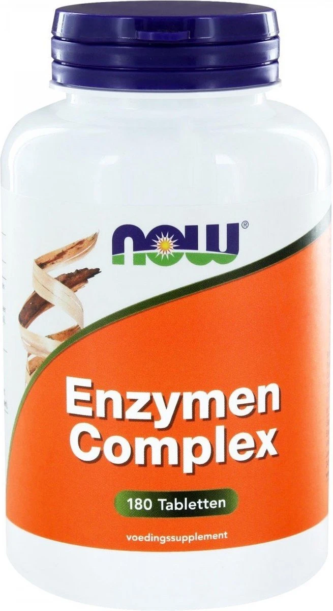 NOW Enzymen complex – Breed spectrum enzymencomplex. – De tabletten zijn gecoat om de enzymen te beschermen tegen de inwerking van maagzuur.**Samenstelling per tablet**Betaine HCl 200 mgOssengal extract (levert 45 mg cholinezuur) 100 mgPapaja (Carica papaya) (fruit) extract 45 mgEnzymenmix 182 mg waarvan: Pancreatine 10X (levert Amylase 20.000 USP, Protease 20.000 USP, Lipase 1.600 USP) Bromelaine (uit ananas)120 GDU Papaine (uit papaja)100.000 FCCPU Cellulase10 FCC CU Pepsine500.000 FCC pepsine units **Ingredienten:** ENZYMEN (sulfiet), Vulstof (Cellulose), Antiklontermiddelen (Siliciumdioxide, Vernet natriumcarboxymethylcellulose, Calciumcarbonaat, Vetzuur, Magnesiumstearaat), Coating (Farmaceutisch glazuur). **Gebruik:** 1 tablet tijdens of vlak na iedere maaltijd. Koel (maar niet in de koelkast) en droog bewaren.**Fabrikant:** NOW, VS **Exclusief distributeur:** VitOrtho BV Laan van Waalhaven 323 2497 GL Den HaagDit product is een voedingssupplement. Aanbevolen dosering niet overschrijden. Een gevarieerde, evenwichtige voeding en een gezonde levensstijl zijn belangrijk. Een voedingssupplement is geen vervanging van een gevarieerde voeding. Buiten bereik van jonge kinderen houden. Droog, afgesloten en bij kamertemperatuur bewaren, tenzij anders geadviseerd op het etiket. Raadpleeg een deskundige alvorens supplementen te gebruiken in geval van zwangerschap, lactatie, medicijngebruik en ziekte.