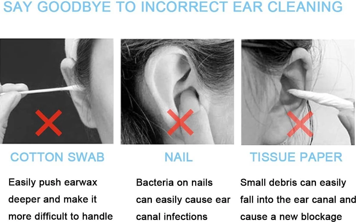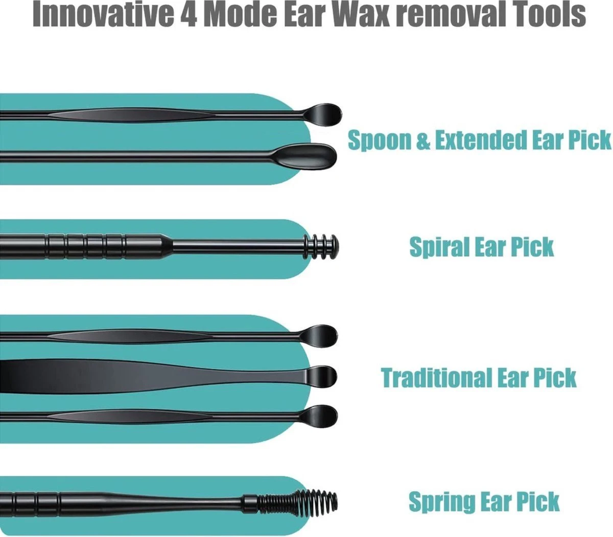 Verschillende maten van de oordopjes kunnen op verschillende gehoorgangen worden aangebracht. Het speciale veerontwerp is zeer effectief voor het verzamelen van zowel olieachtig oorsmeer als droog oorsmeer. 6 curettereinigers van verschillende grootte om zowel zacht als hard oorsmeer efficiënt te reinigen en om uw gehoorgangen een ontspannende massage en goede reiniging te geven.