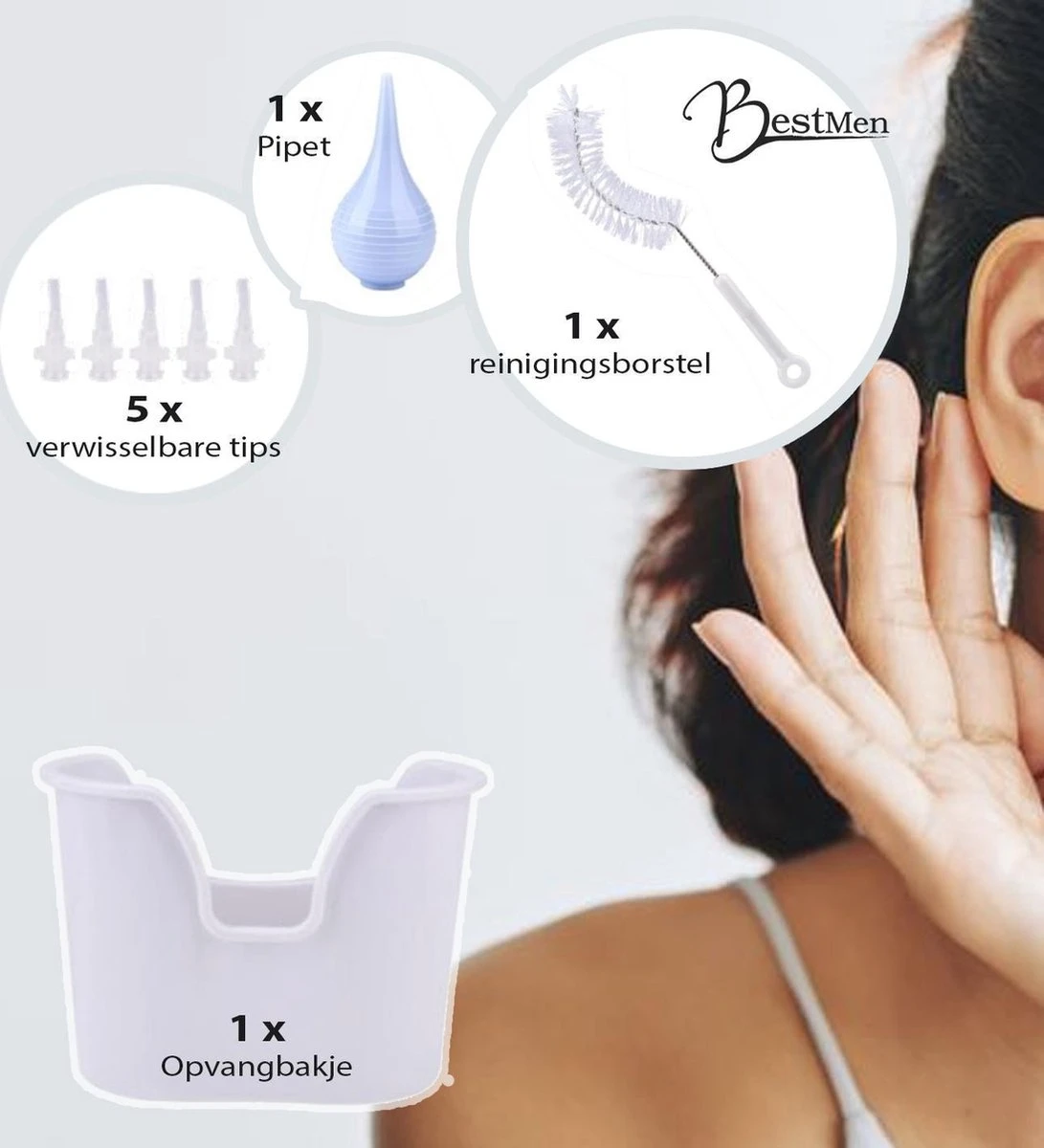Met de oor reinigingsset hoeft u niet meer langs de arts voor het doorspuiten van uw gehoorkanaal. U kunt vanaf nu gewoon zelf thuis uw oren reinigen. De reinigingsset van Bestman is veilig en ideaal voor het verwijderen van overtollig oorsmeer. De reinigingsset is vergelijkbaar met de instrumenten die door KNO-artsen en KNO-klinieken worden gebruikt om oorsmeer op een pijnloze en gemakkelijke manier te verwijderen bij volwassenen en kinderen.