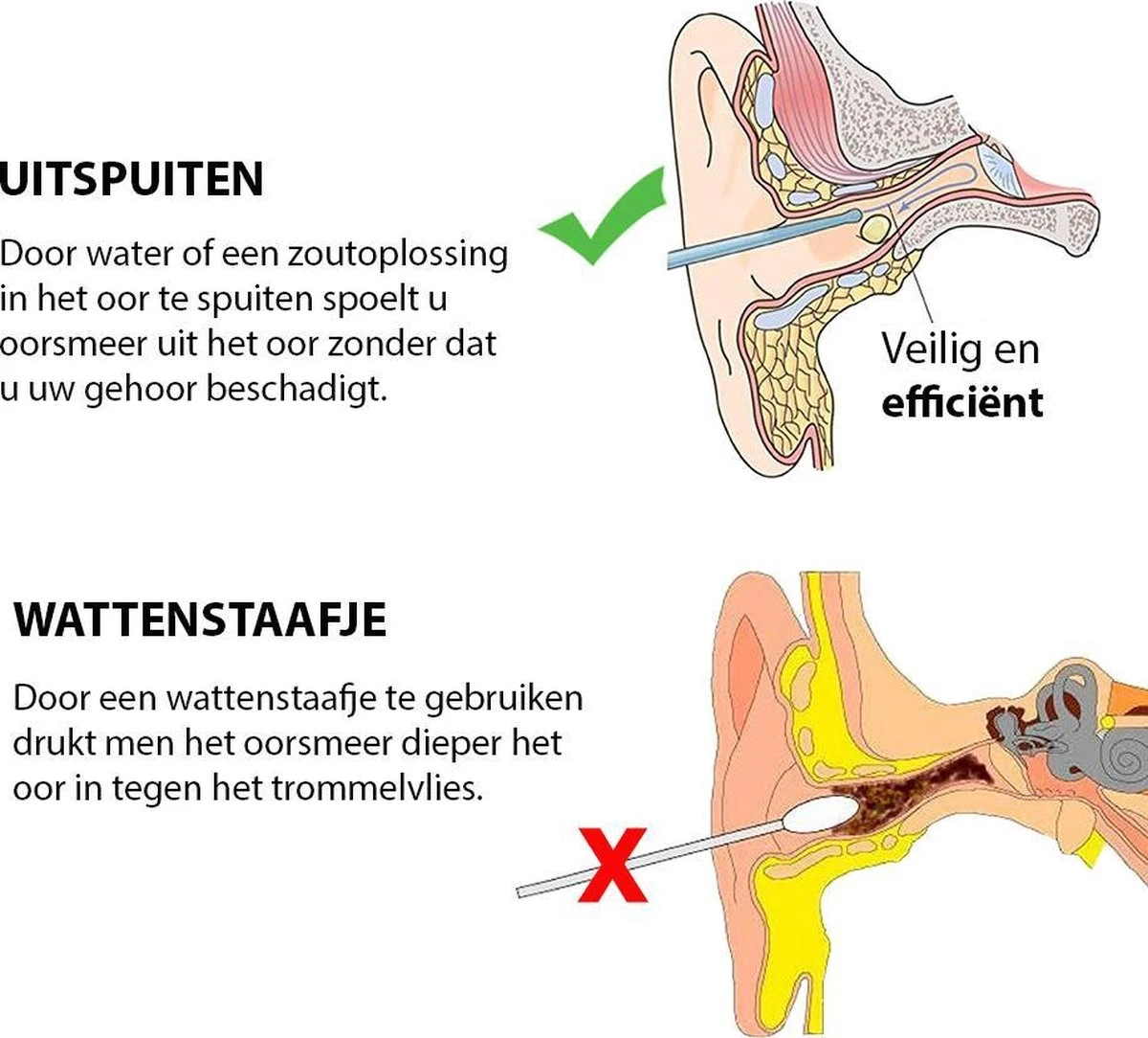 Conventionele methode zoals het gebruiken van wattenstaafjes en oorschroeven zijn niet alleen ineffectief, maar ook nog eens gevaarlijk voor uw gehoorgang. U kunt met de wattenstaafjes opgehoopt oorsmeer tegen het trommelvlies aandrukken of deze beschadigen. Met het gebruik van onze nieuw simpelere methoden – die tevens ook al jaren wordt gebruikt door huisartsen – reinigt u de oren zonder gevaar. Het water kan uw trommelvliezen niet beschadigen. Ook zijn die uiteinden van deze set zo ontworpen dat u nooit te diep in uw gehoorhang kunt komen.