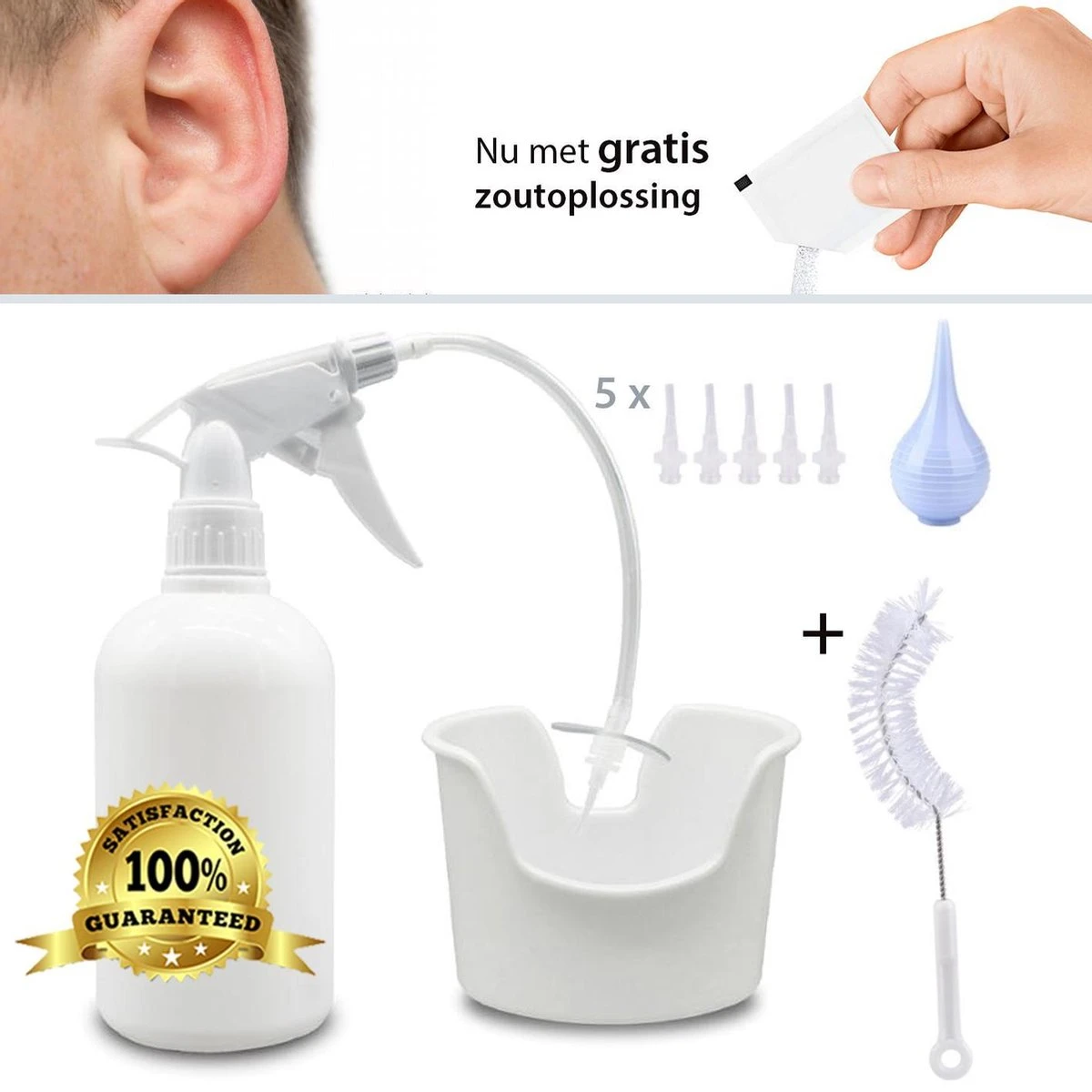 In de verpakking treft u de complete set aan waarin alles nodig zit dat u nodig heeft om tot een schoon resultaat te komen. De set bestaat uit een waterpomp met daarop gemonteerd een flexibele buis. Deze buis heeft aan het uiteinde een plastic ring zitten om te voorkomen dat u te diep in uw gehoorgangen komt met de spuitmond. De spuitmondjes zijn verwisselbaar en daarvan krijgt u er in totaal 6 meegeleverd. Ook komt de set met een speciaal ontworpen basin dat precies om uw oor past. U kunt het bakje met uw schouder tegen het oor klemmen. Ook komt de set met ene borstel om de set te reinigen en een extra ballonpompje zodat u nog gecontroleerder water in uw oren kunt laten lopen. Kortom, in deze set zit állés wat u nodig heeft.
