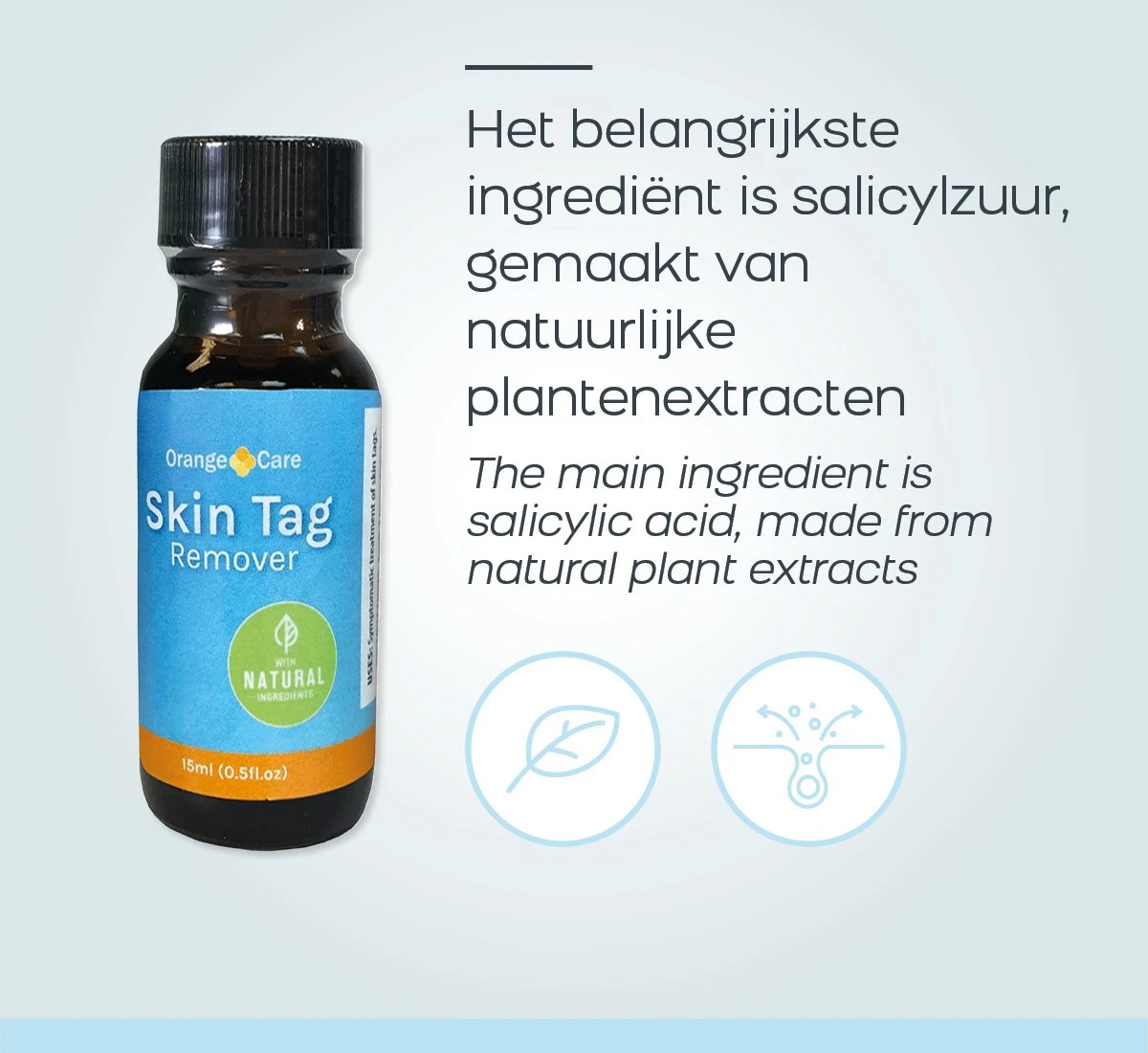 Het geheim van Orange Care Skin Tag Remover is Salicylic Acid ofwel Salicylzuur. Dat is een natuurlijk en revolutionair ingrediënt, gemaakt van natuurlijke plantenextracten. Salicylzuur staat bekend om zijn ontstekingsremmende en antibacteriële eigenschappen en is een lichte exfoliant. Samen met de andere natuurlijke ingrediënten zorgt het ervoor dat fibromen uitdrogen tot ze probleemloos loskomen. Wil je een zachte en gezonde huid, dan is de Skin Tag Remover het middel dat je zoekt.