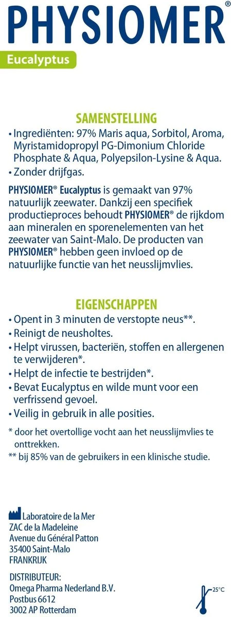 Ingrediënten: Samenstelling: Natuurlijk zeewater, Hypertonische concentratie van 22 g/l minerale zouten, hulpstoffen: essentiële olie van Eucalyptus globulus en natuurlijk extract van wilde munt. Dankzij een specifiek productieproces behoudt Physiomer Eucalyptus de rijkdom aan mineralen en sporenelementen van het zeewater van Saint-Malo.