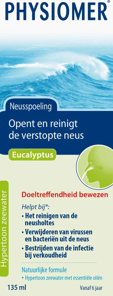 Last van een verstopte neus? Physiomer Eucalyptus opent effectief de verstopte neus binnen 3 minuten*. De neusspoeling opent snel de verstopte neus, helpt virussen en bacteriën te verwijderen en de infectie te bestrijden bij verkoudheid**. Bovendien reinigt Physiomer de neus en bevat het Eucalyptus en wilde munt voor een verfrissend gevoel. Physiomer Eucalyptus bevat een 100% natuurlijke formule van hypertoon zeewater met essentiële oliën zonder conserveermiddel of drijfgas.