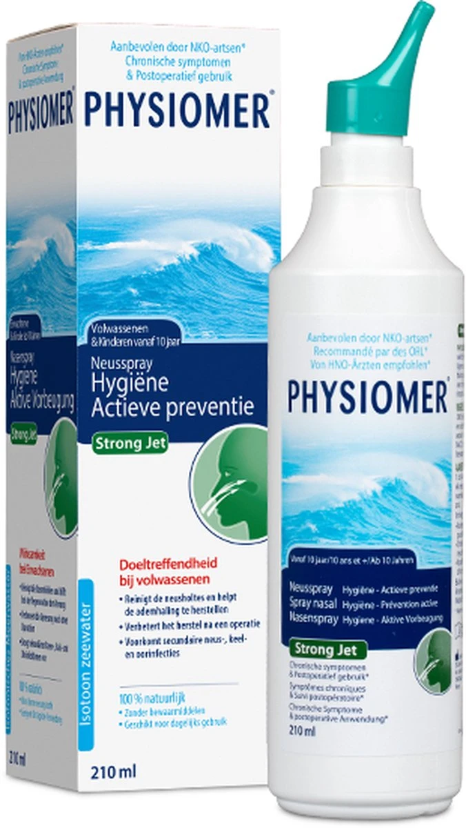 Last van een verstopte neus? Physiomer Strong Jet Neusspray zorgt voor een reiniging van de neusholtes. De verstuiver is aangepast naar de vorm van de neusholtes, wat een veilige toepassing mogelijk maakt. PHYSIOMER® Strong Jet reinigt en bevochtigt de neusholtes. Spoelt de neusholtes grondig dankzij een krachtige verstuiving van zeewater en helpt beter door de neus te ademen. PHYSIOMER® Strong Jet verlicht de verstopte neus en verwijdert dikke, etterige afscheiding of korsten bv. na chirurgische ingreep of bij chronische neusholte aandoeningen*. 100 % zeewater: dankzij een specifiek productieproces behoudt PHYSIOMER® de rijkdom aan mineralen van het zeewater.De neusspray zorgt voor: