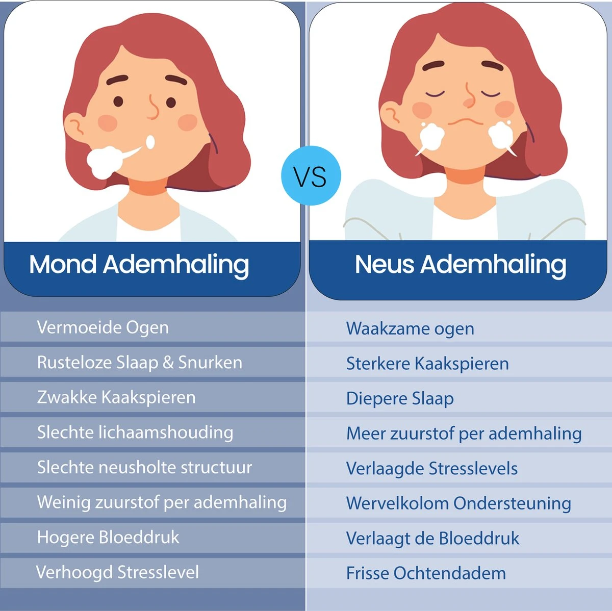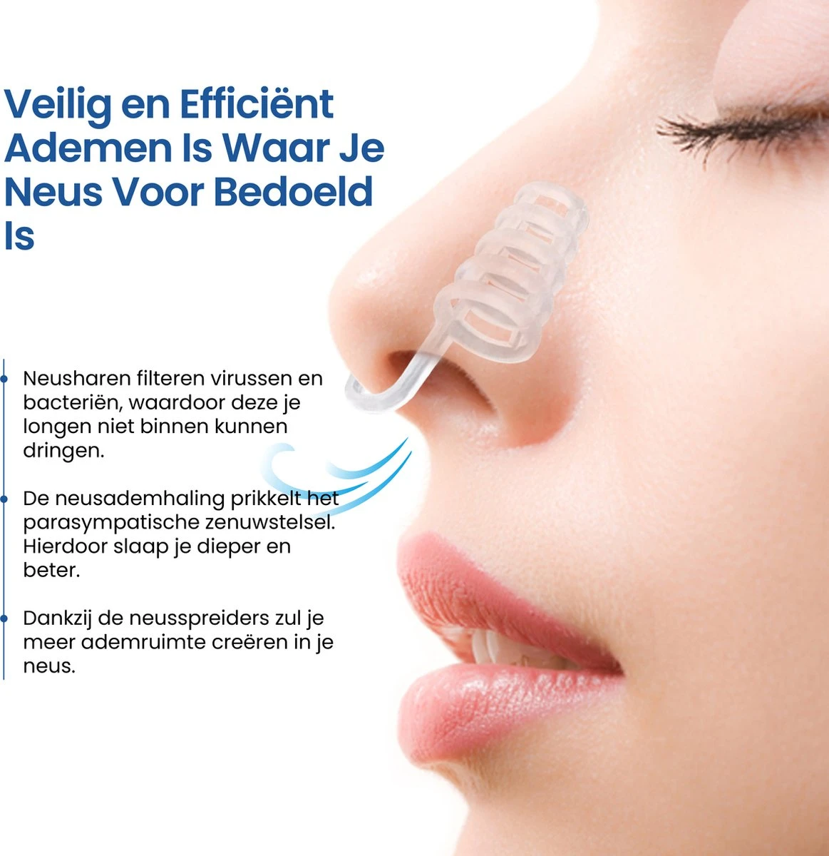 De neusademhaling prikkelt het parasympatische zenuwstelsel. Hierdoor slaap je dieper en beter. Dankzij de neusspreider wordt je uitgerust wakker en heb je zin om aan de dag te beginnen. Onze neus werkt als een antivirus systeem voor het filteren van de lucht die wij inademen. Op het moment dat je de hele nacht of dag door je mond ademt, verhoog je de kans op besmettingen en ziekte. Hierom is het belangrijk om niet alleen overdag, maar ook in de nacht door de neus te ademen.