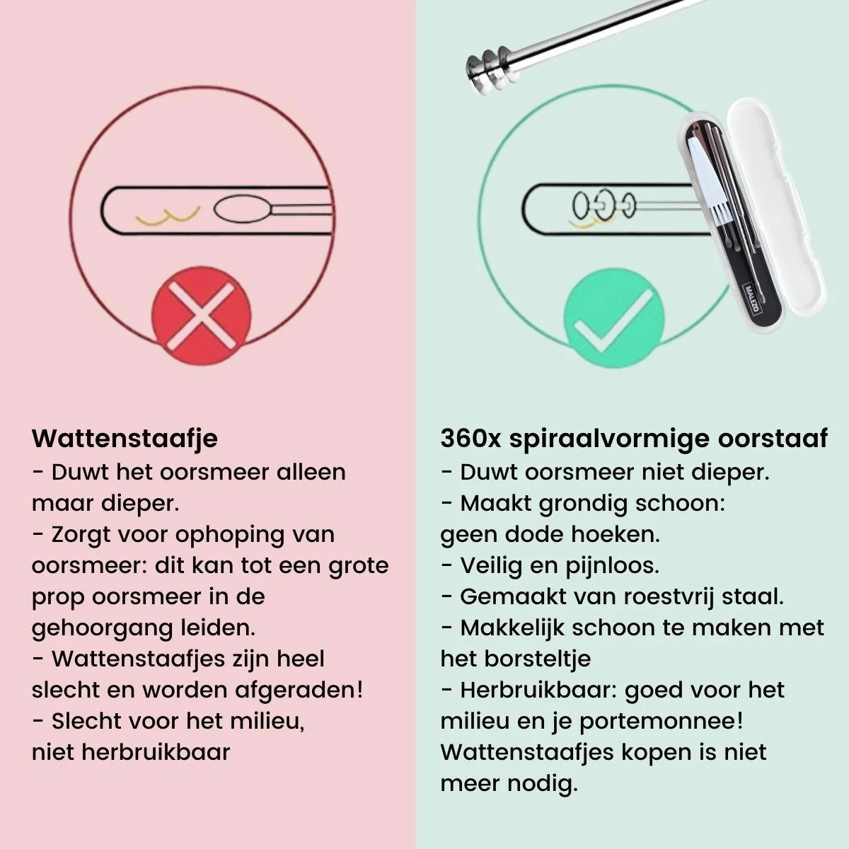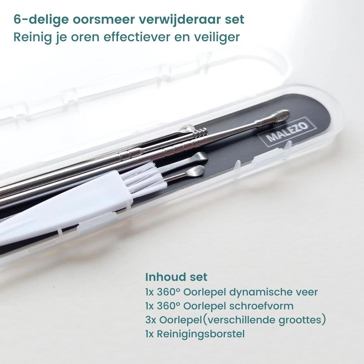Sluit je aan bij de nieuwe, effectievere én veiligere manier van oorsmeer verwijderen! Met de MALEZO™ 6-delige Oorsmeer Verwijderaar Set zijn wattenstaafjes verleden tijd. Wist je dat wattenstaafjes eigenlijk heel slecht zijn? Wattenstaafjes duwen het oorsmeer in het oor, waardoor er uiteindelijke en prop oorsmeer in de gehoorgang terecht kan komen. De MALEZO 6-delige Oorsmeer Verwijderaar set bestaat uit 6 RVS tools waarbij oorsmeer gemakkelijk verwijderd kan worden, zonder het in het oor te duwen. Dit komt door het holle karakter van de 360 graden spiraalvormige oorlepel. In combinatie met de overige tools zullen je oren optimaal schoon zijn! Eventuele jeuk in de oren zal hierdoor ook verminderen.