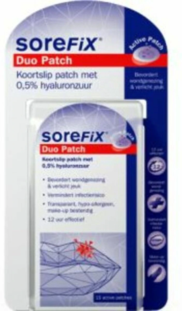 SoreFix Duo Patch is een ultradunne, transparante, hypoallergene patch die zich aan de lip hecht. De patch bevat 0,5% hyaluronzuur die de koortslip actief hydrateert. Hierdoor wordt het herstel van de koortslip bevorderd, de jeuk verlicht, een beschermlaag gecreëerd tegen externe invloeden, het besmettingsrisico verminderd en littekenvorming voorkomen. De patch vormt een barrière op de lip en is make-up bestendig.