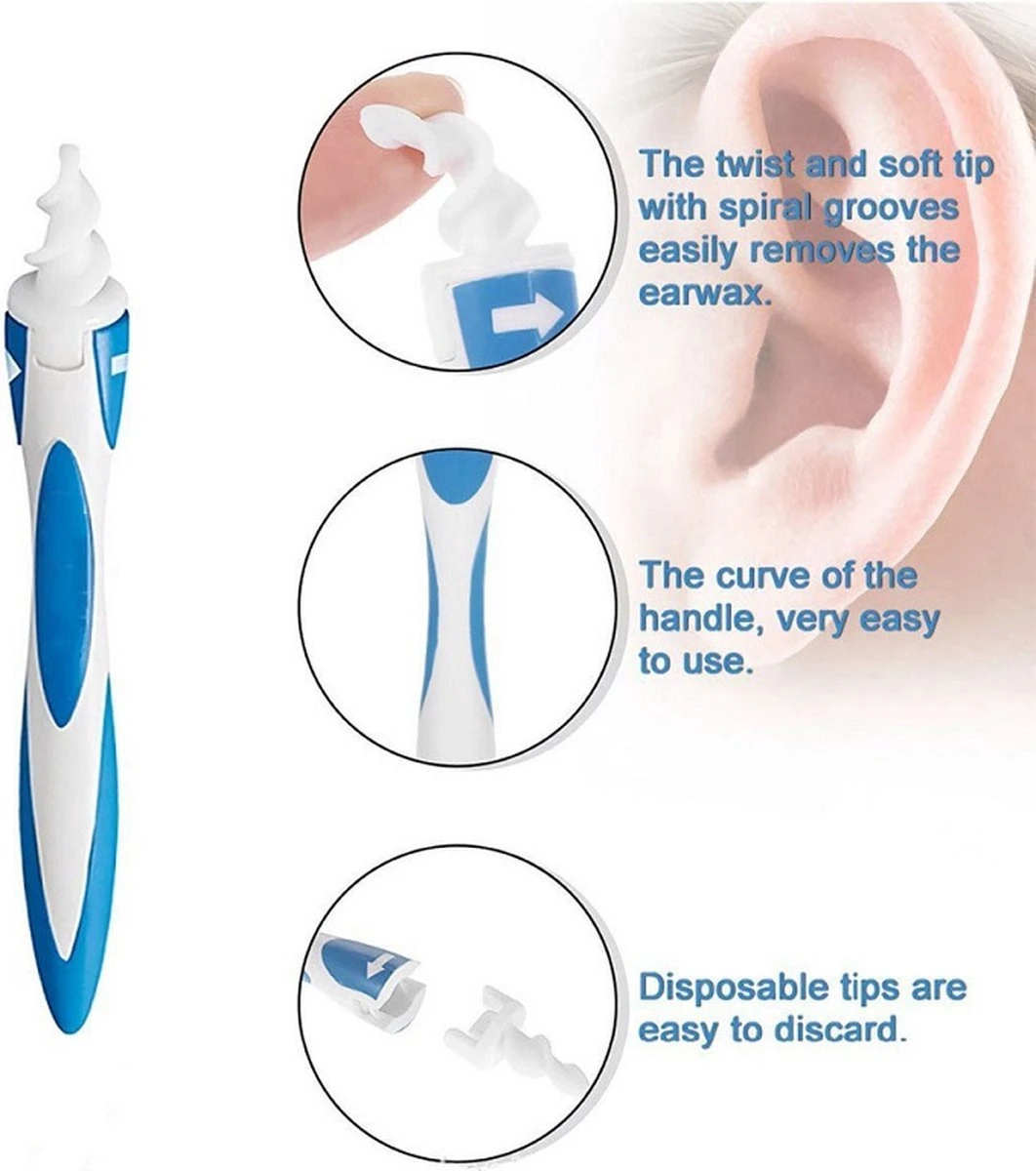 Eenvoudig – Plaats de spiraalvormige kopje binnenin het oor en draai zachtjes het oorsmeer uit het oor zonder jouw oren te beschadigen. Draai eenvoudig aan het handvat en de zachte, flexibele punt met spiraalvormige groeven verwijdert eenvoudig de oorsmeer.
