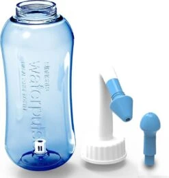 Gebruik een zoutoplossing (of maak deze zelf met keukenzout zonder jodium). Gebruik een van de twee opzetstukjes, welke te herkennen zijn aan de verschillende vormen gaatjes. Bevestig het opzetstukje aan het tuitje en draai deze vast aan het waterreservoir. Houd de fles ondersteboven en stop het tuitje in je neus en knijp in de fles om het water te spuiten. Hoe harder je knijpt, hoe meer water je spuit. Begin altijd voorzichtig en bouw langzaam op
