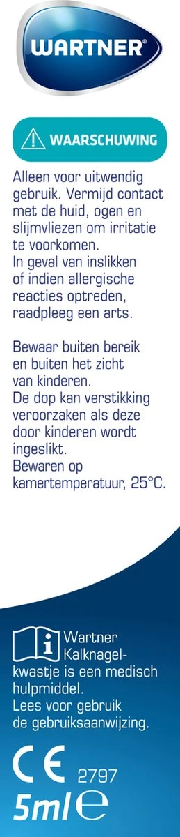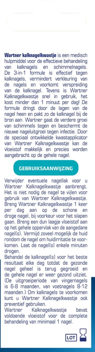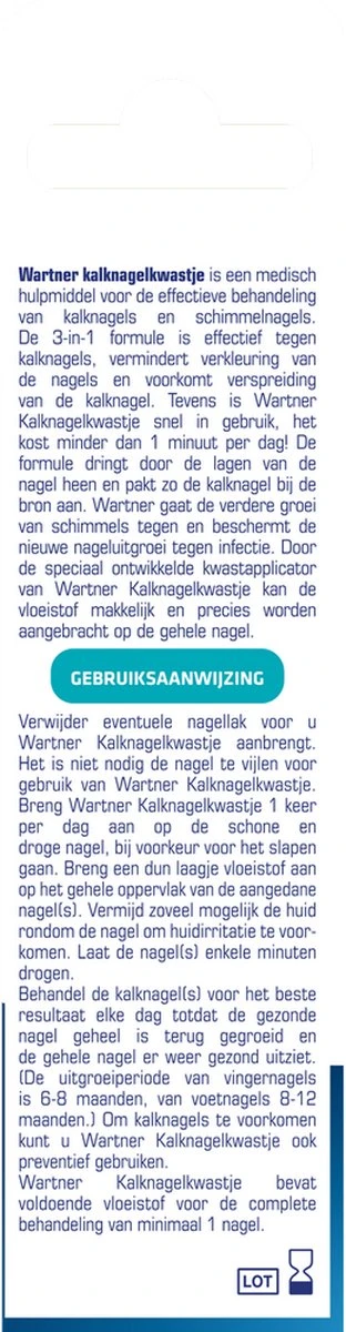 Wartner Kalknagelkwastje is een medisch hulpmiddel voor de effectieve behandeling van kalknagels en schimmelnagels. De 3-in-1 formule is effectief tegen kalknagels, vermindert verkleuring van de nagels en voorkomt verspreiding van de kalknagel. Tevens is Warner Kalknagelkwastje snel in gebruik, het kost minder dan 1 minuut per dag! De formule dringt door de lagen van de nagel heen en pakt zo de kalknagel bij de bron aan. Wartner gaat de verdere groei van schimmels tegen en beschermt de nieuwe nagelgroei tegen infectie. Door de speciaal ontwikkelde kwastapplicator van Wartner Kwalknagelkwastje is de vloeistof goed te doseren en kan het makkelijk en precies worden aangebracht op de gehele nagel. De 3-in-1 formule van Wartner Kalknagelkwastje is effectief tegen kalknagels, vermindert verkleuring van de nagels en voorkomt verspreiding van de kalknagel.