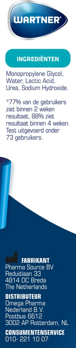 * 77% van de gebruikers zag na 2 weken resultaat. 88% zag resultaar na 4 weken. Test uitgevoerd onder 73 gebruikers. Wartner Kalknagelkwastje is een medisch hulpmiddel. Lees voor gebruik de gebruiksaanwijzing
