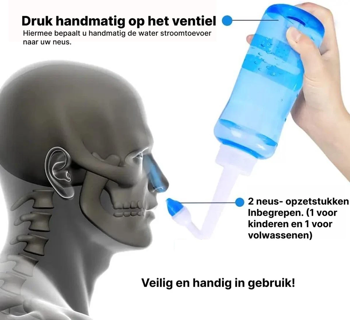 jaar). Met een inhoud van 300 milliliter maak je je neus gemakkelijk meerdere keren schoon. Het kan bijvoorbeeld gebruikt worden bij pollenallergie (koorts) of een vervuilde neus. De fles is gemaakt van BPA-vrij plastic en is daarom veilig voor menselijke consumptie zonder dat er giftige stoffen uit het plastic vrijkomen.
