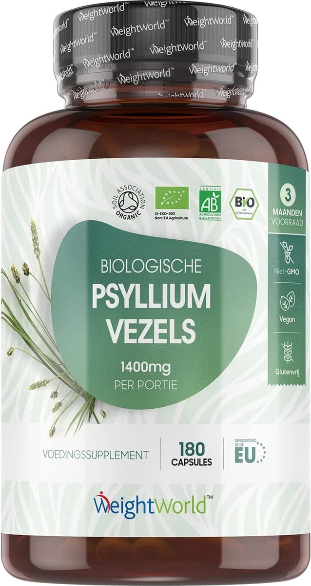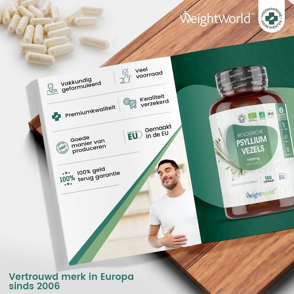 Biologisch Psyllium Husk (Plantago Ovata) Poeder, #Plantaardige Capsule: Hypromellose (HPMC).